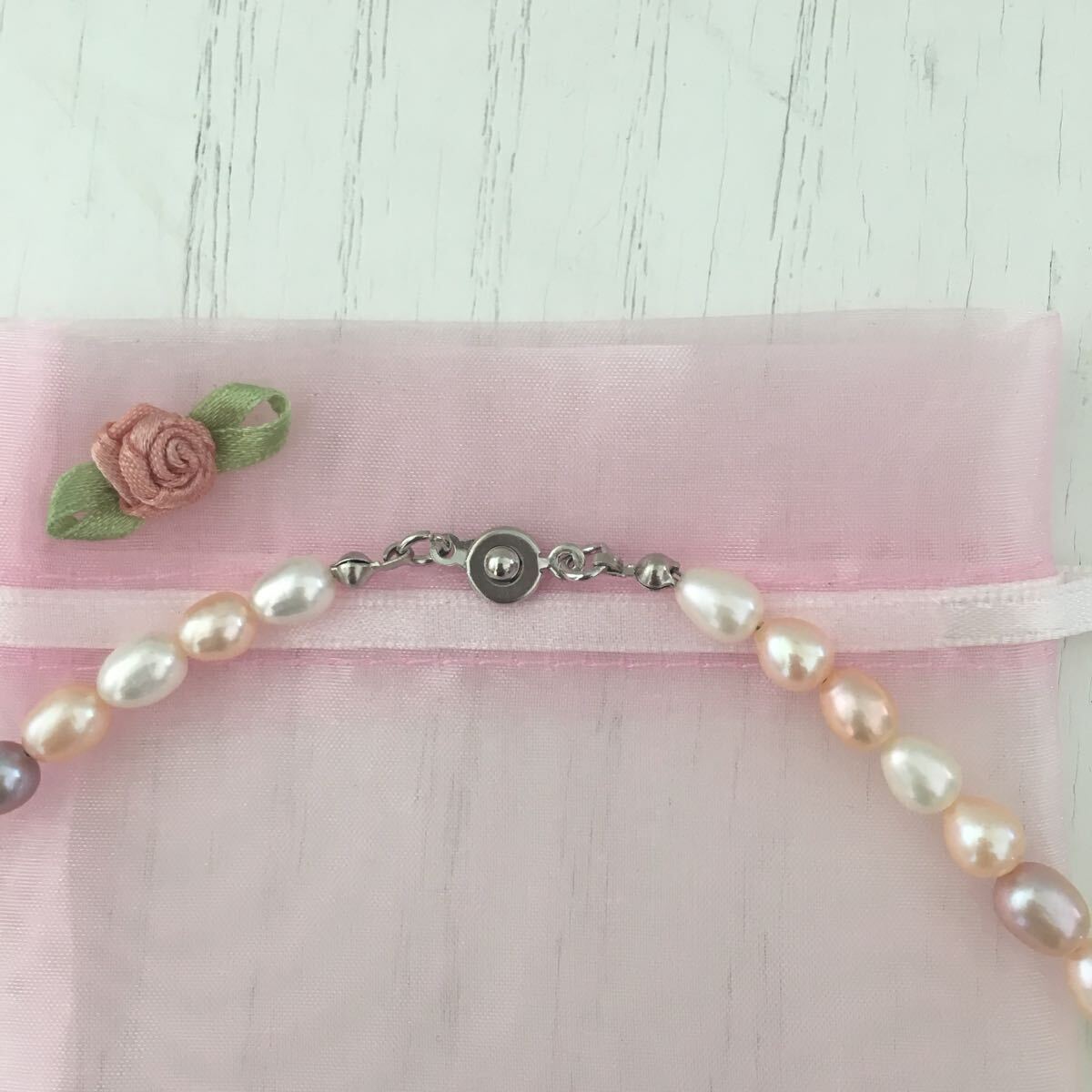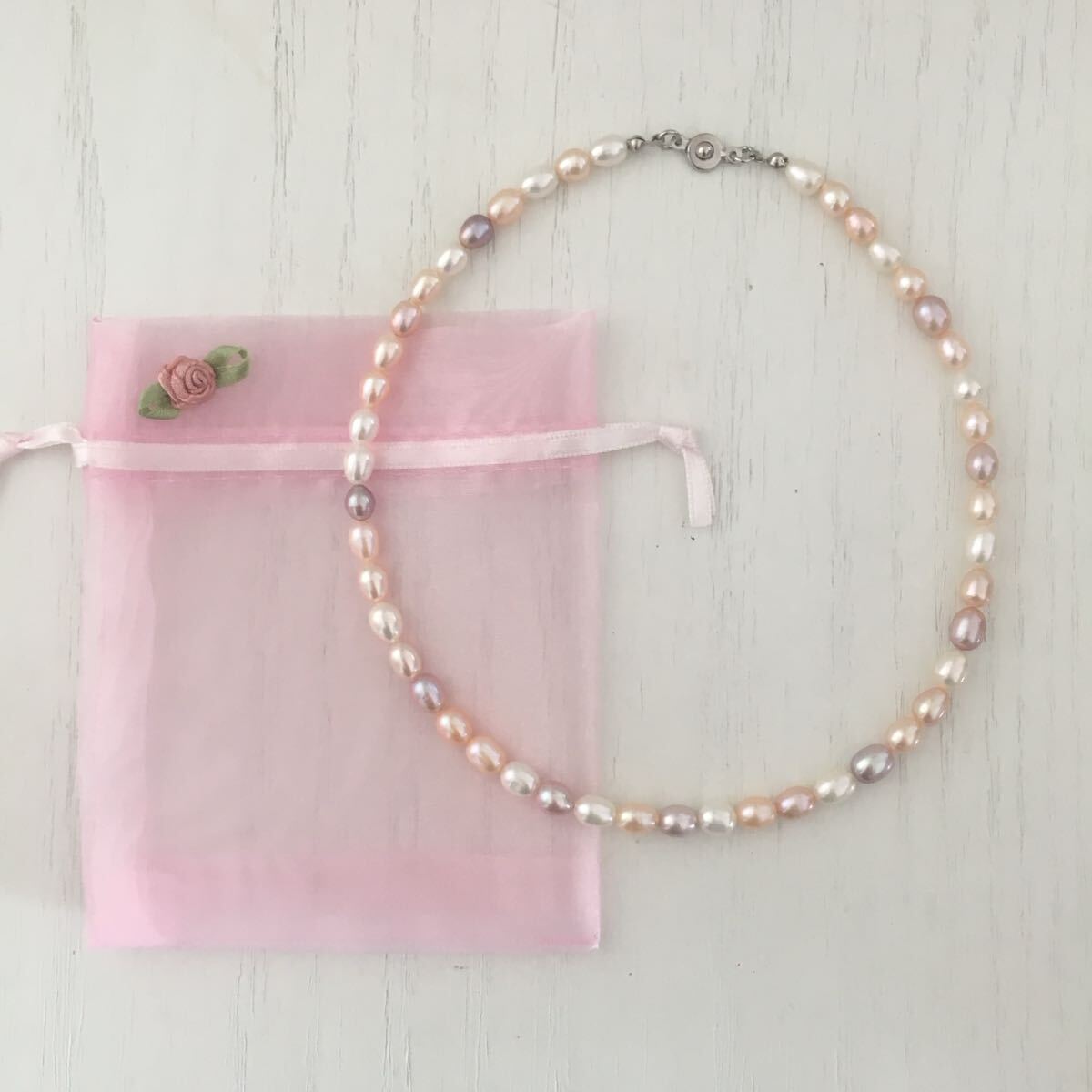 今回の淡水パールの色付き(薄いオレンジ、薄いピンク、ホワイトのパールです。)を外国で仕入れて、首回りが1番、綺麗に見える約39㎝〜約43㎝で長さをオーダーしてハンドメイドで作って貰いました☆