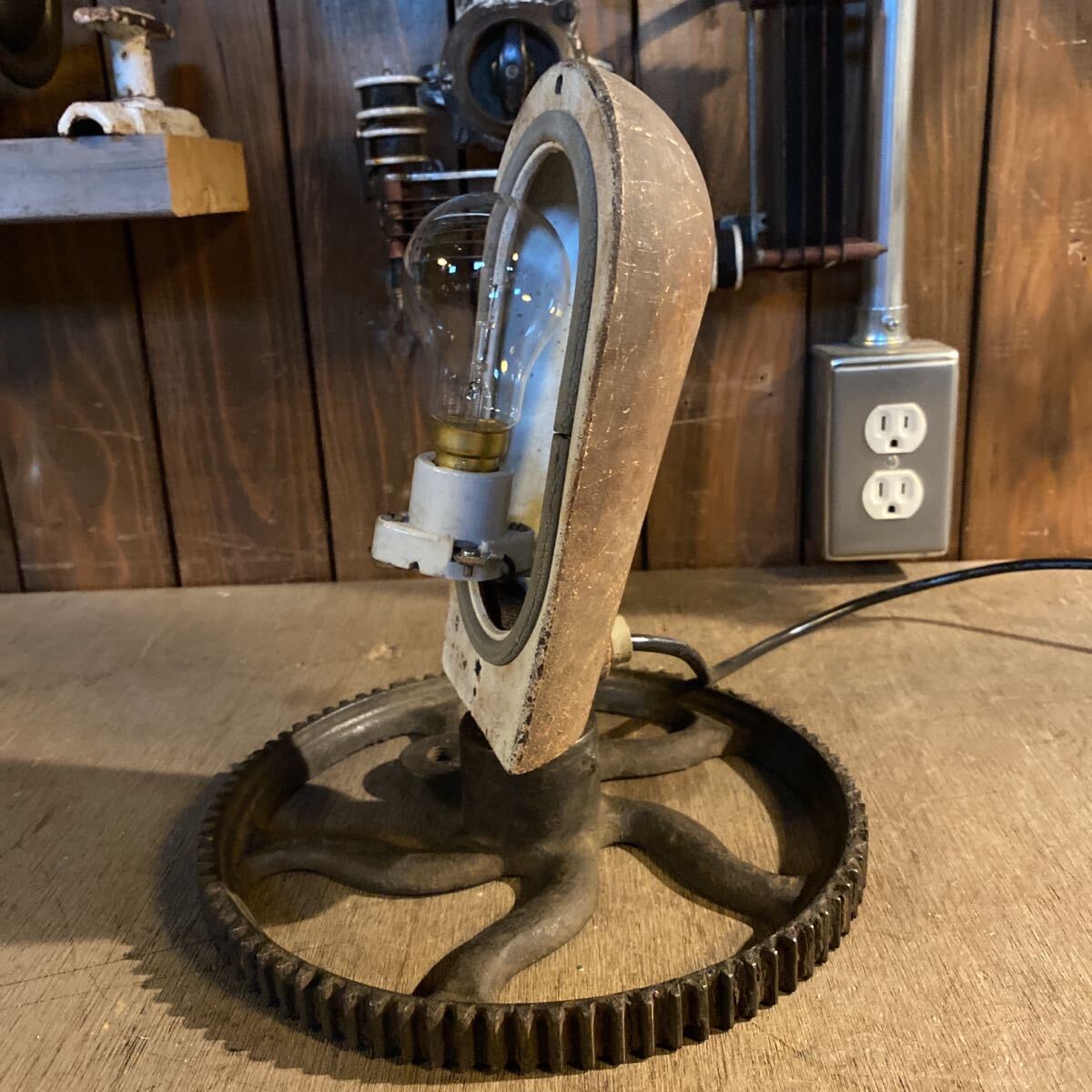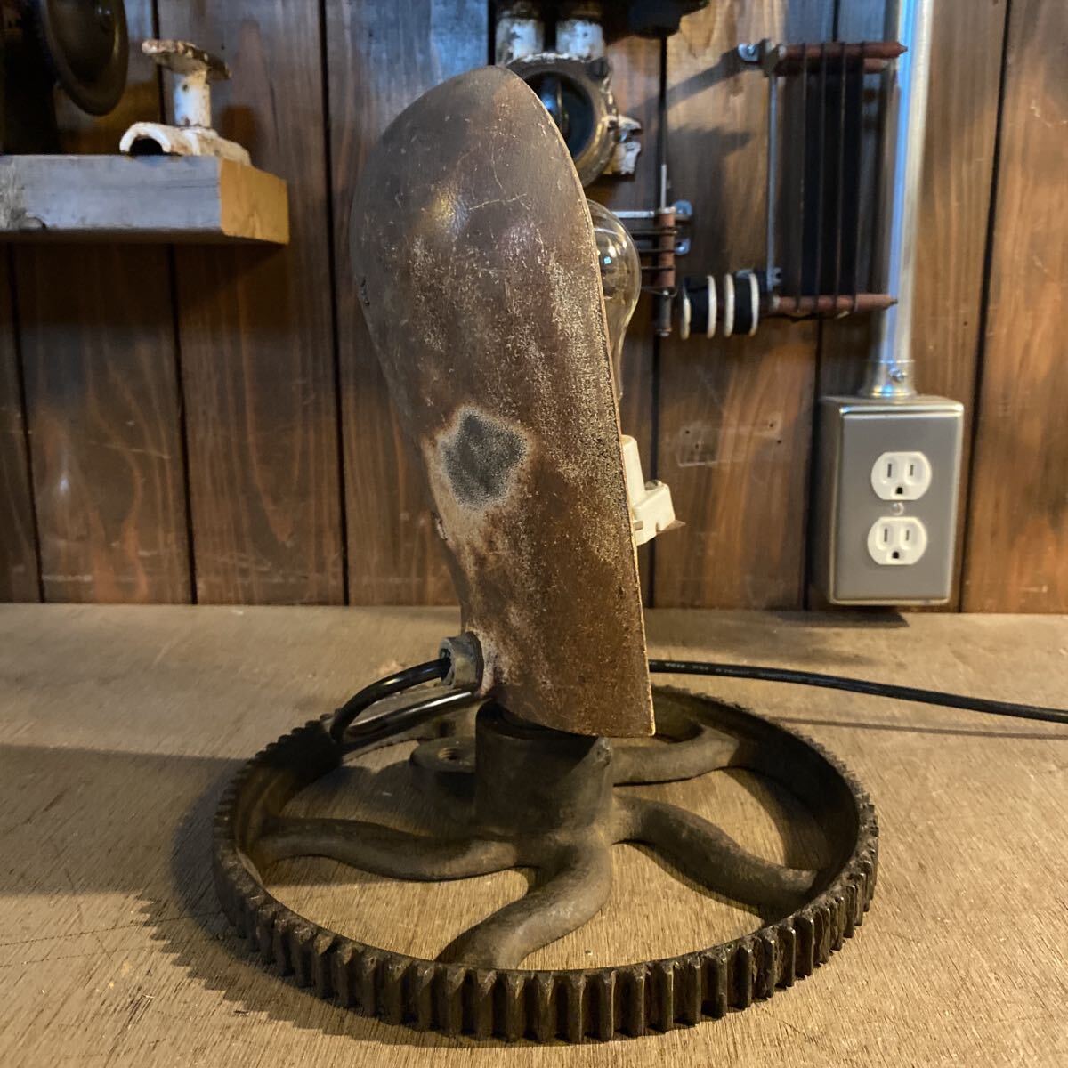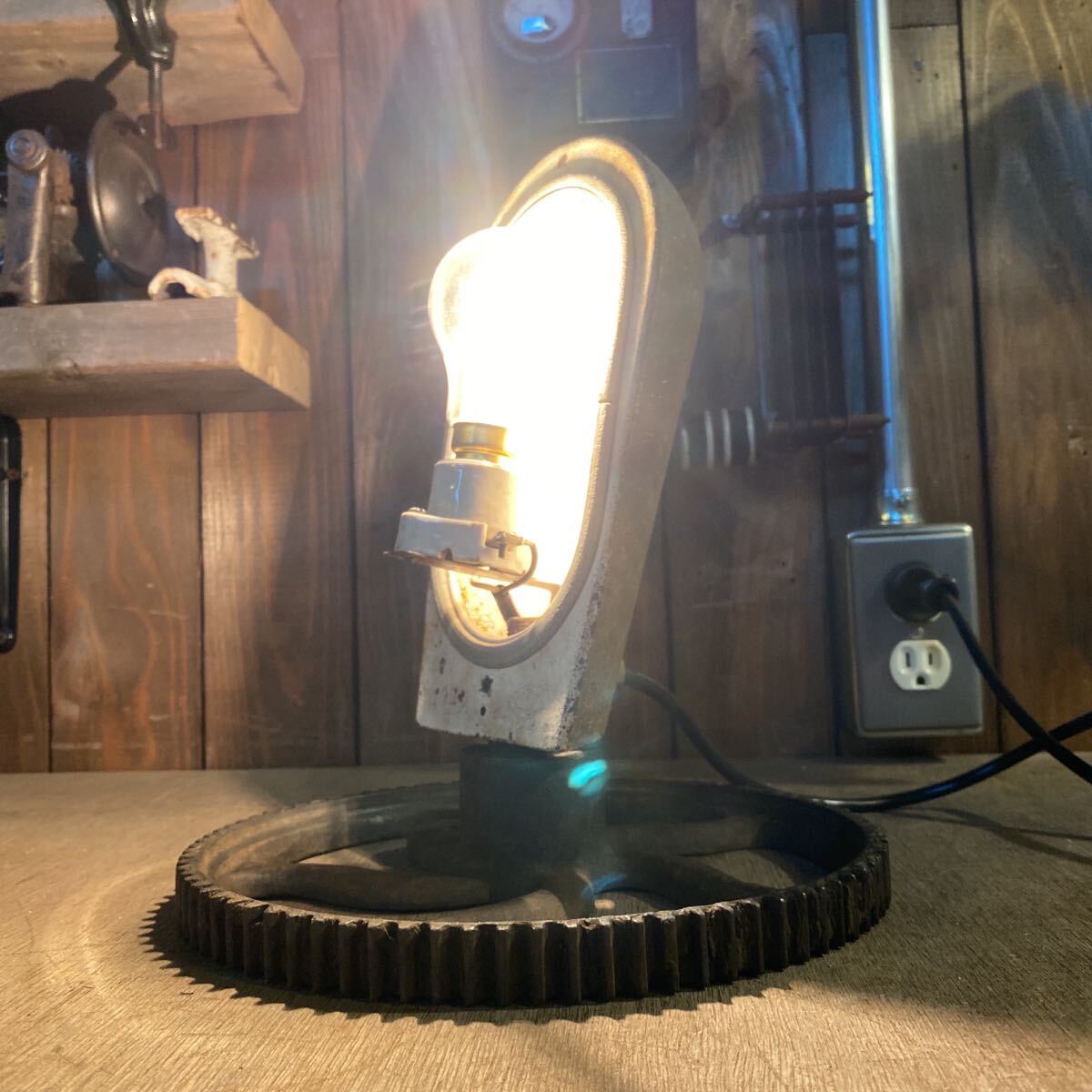 古い照明器具と工業系のパーツを組み合わせたオリジナルのランプ。