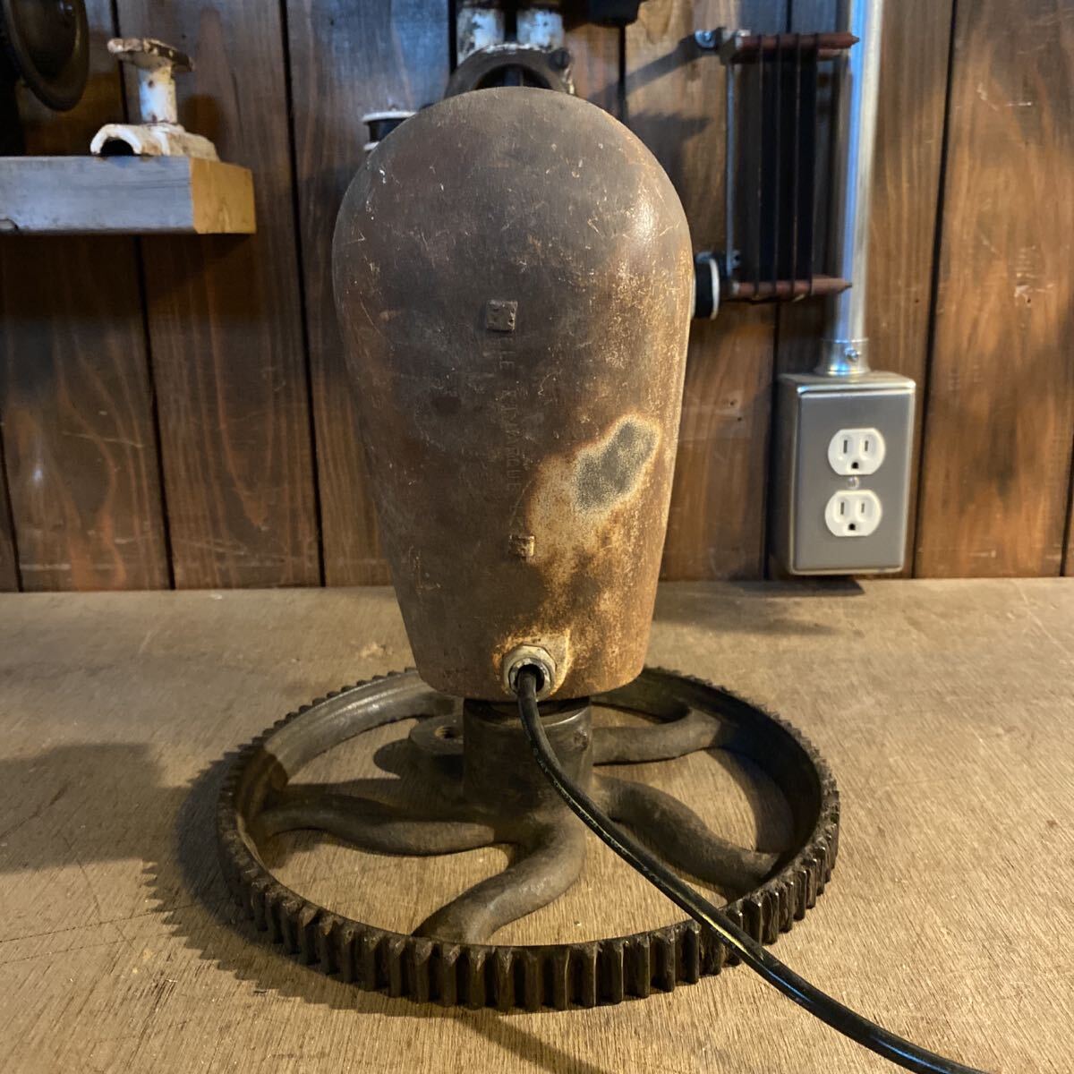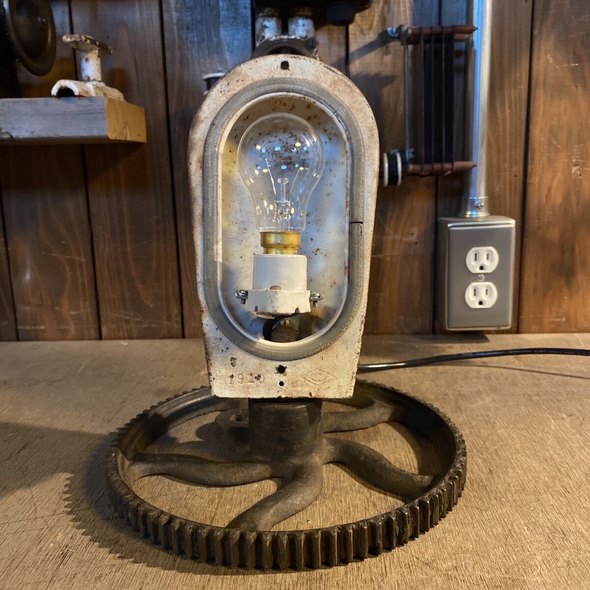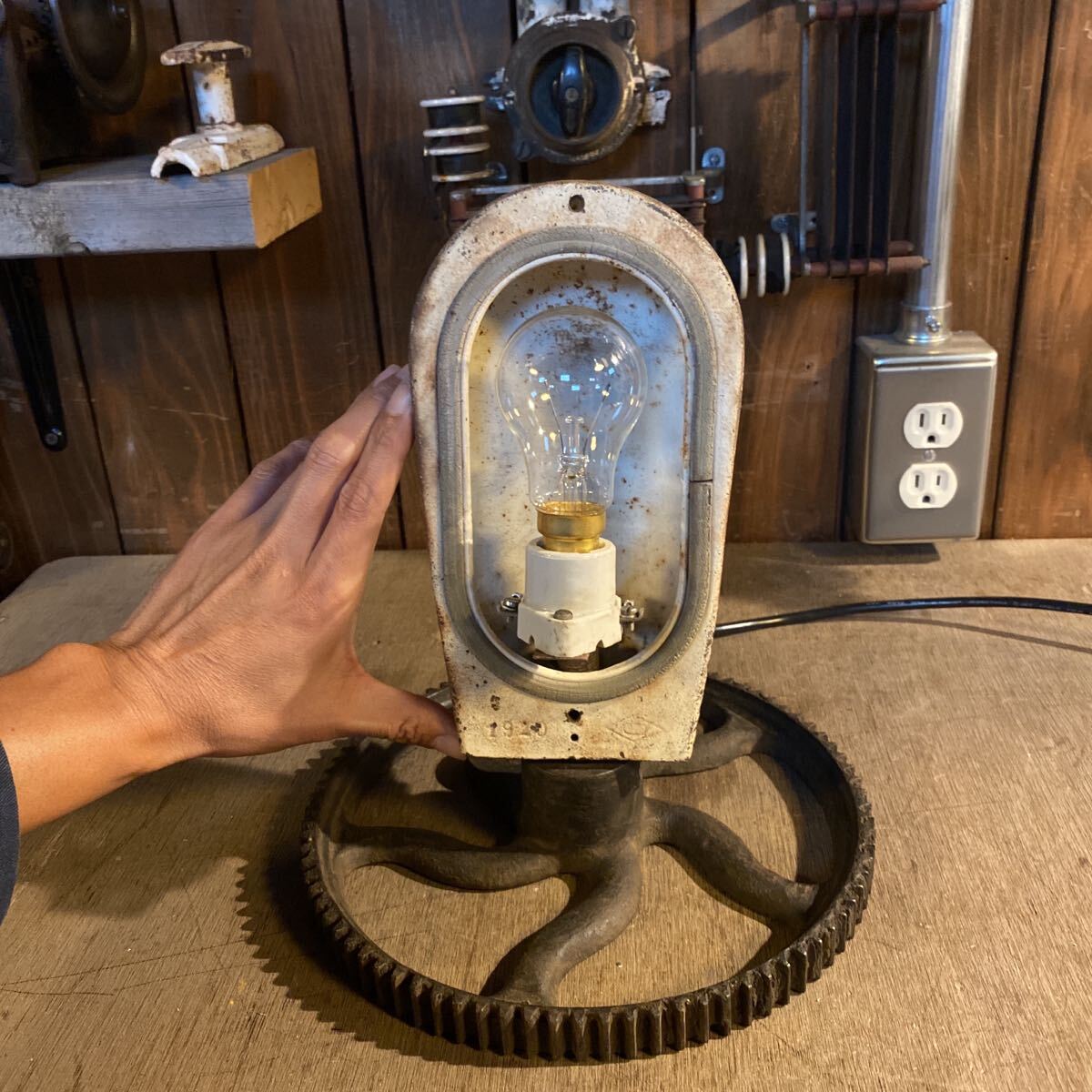 古い照明器具と工業系のパーツを組み合わせたオリジナルのランプ。