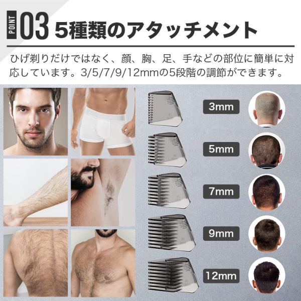 ボディシェーバーはひげ剃りだけでなく、ムダ毛のトリミングにも使用できます。 当然、顔、胸、足、手などの部位に簡単に対応しています。それに伴いまして、3/5/7/9/12mmの5段階の刈り高調節できます。 お好みを大切に簡単にカットでき、少しの髪の毛の整理も、床屋に行かずに自宅で簡単に操作できます。