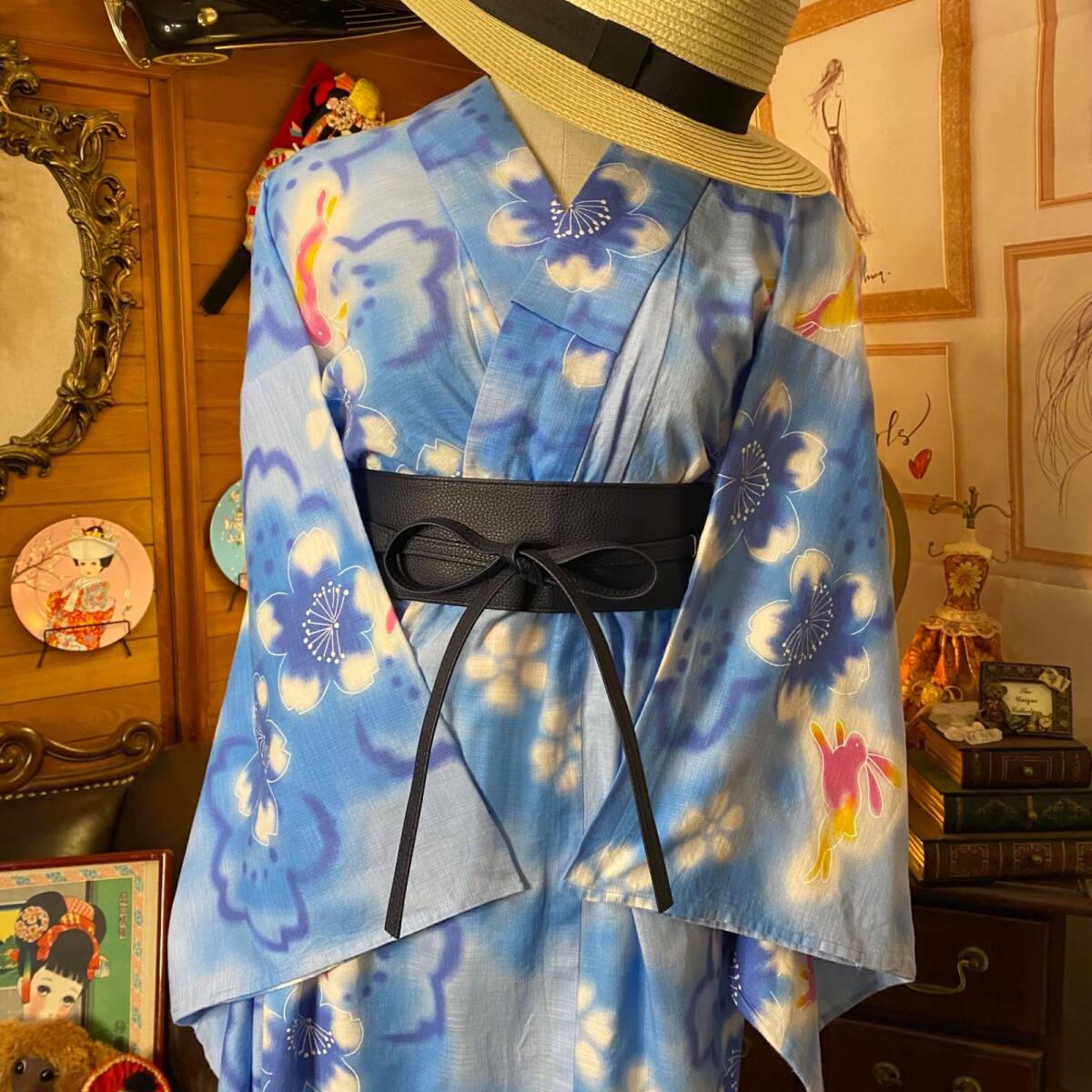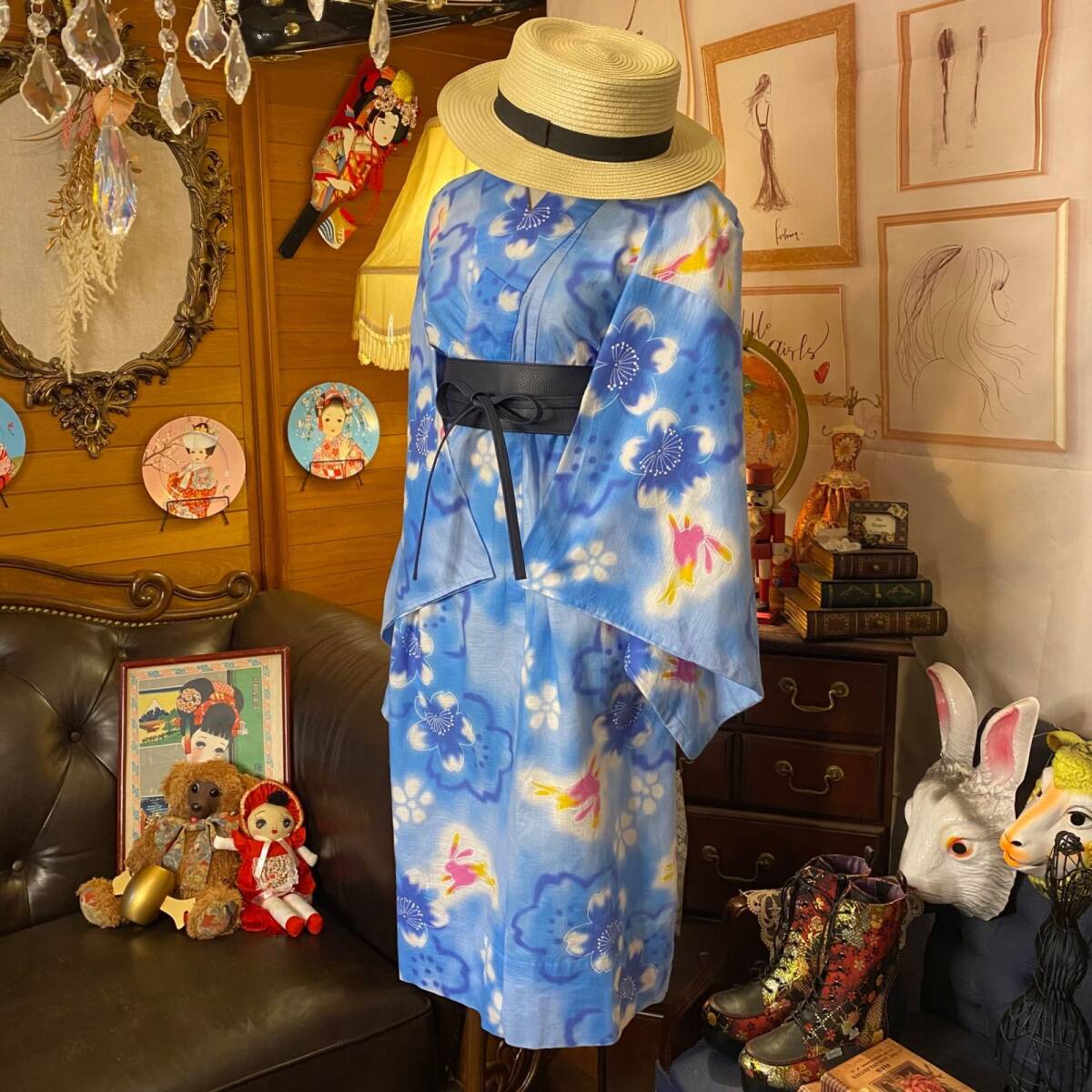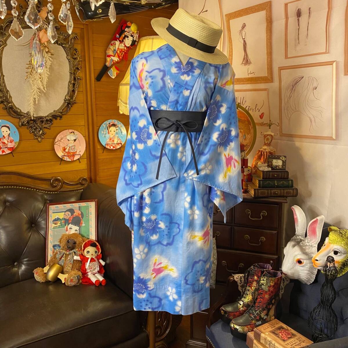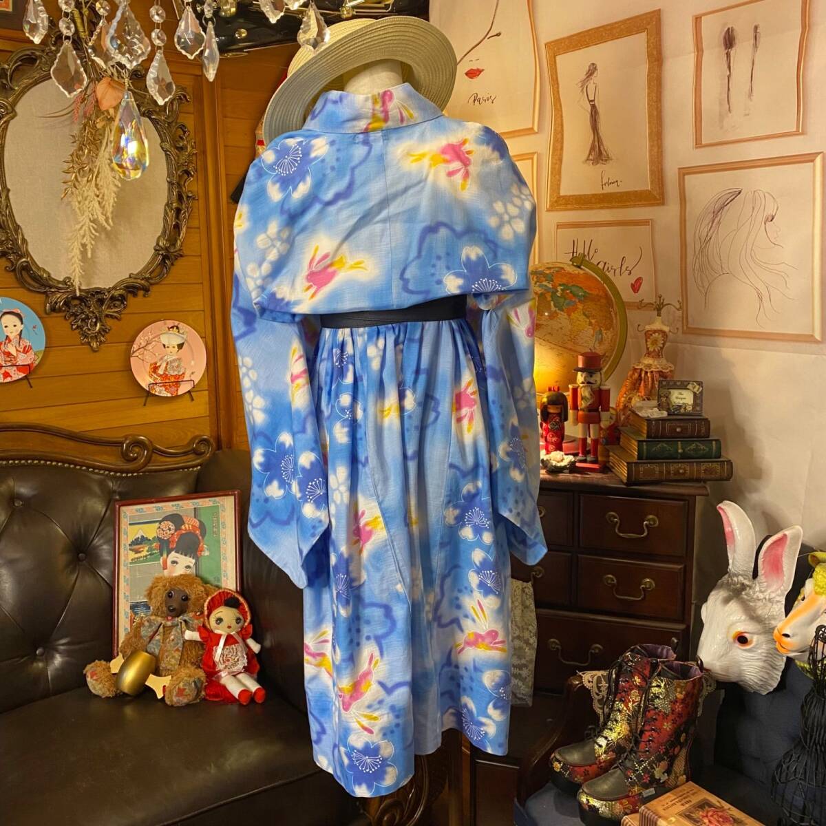【 和洋折衷 浴衣 リメイク ワンピース ドレス サッシュベルト レトロ 古着 和 モダン 素敵なお花とうさぎ柄×涼しげなパステルブルー系 W-249 】
