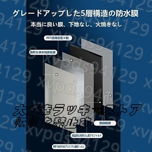 ?グレードアップした5層構造の防水膜?本当に良い膜、下地なし、火焼きなし?PET透明引張り膜?強靭な疎水性防錆層?絶縁膜層?高品質な天然ゴム系アスファルト?厚手で光沢のあるアルミニウム絶縁フィルム?防水性だけでなく、断熱性にも優れ、凍結を恐れず、高温を恐れない。???シナリオ用防水膜。サンルーム目地/屋根目地/コーナーラップ/キャリッジトップ/窓台エッジジョイント/屋根防水全般寸法(幅1m×厚さ1.5mm) (15m)?使用方法は、お掃除して貼るだけ!1.設置作業前に掃除するご使用前に補修表面を掃除をし、地面が乾いていることを確認してください。2.防水シートを貼る接着面のフィルムを剥がし防水シートを設置します。転がしながら貼っていきます。※補修面にゴミや汚れがあると、剥がれやすくなります。満足のいくサービス当社の製品についてご不明な点がございましたら、アフターサービスの問題を解決するために、当社のカスタマーサービスにお気軽にお問い合わせください。 いつでもご連絡いたします。