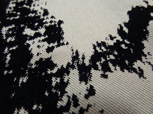 とても不思議なデザイン/加工です。ベージュのベースになるテーラードジャケットの上に黒く見えるものはベロア素材です。ランダムなまだら模様のようなデザインですが,ベロア素材が上に重なっています。やや凹凸感もあり生地感もそこだけ変化する特殊なデザインです