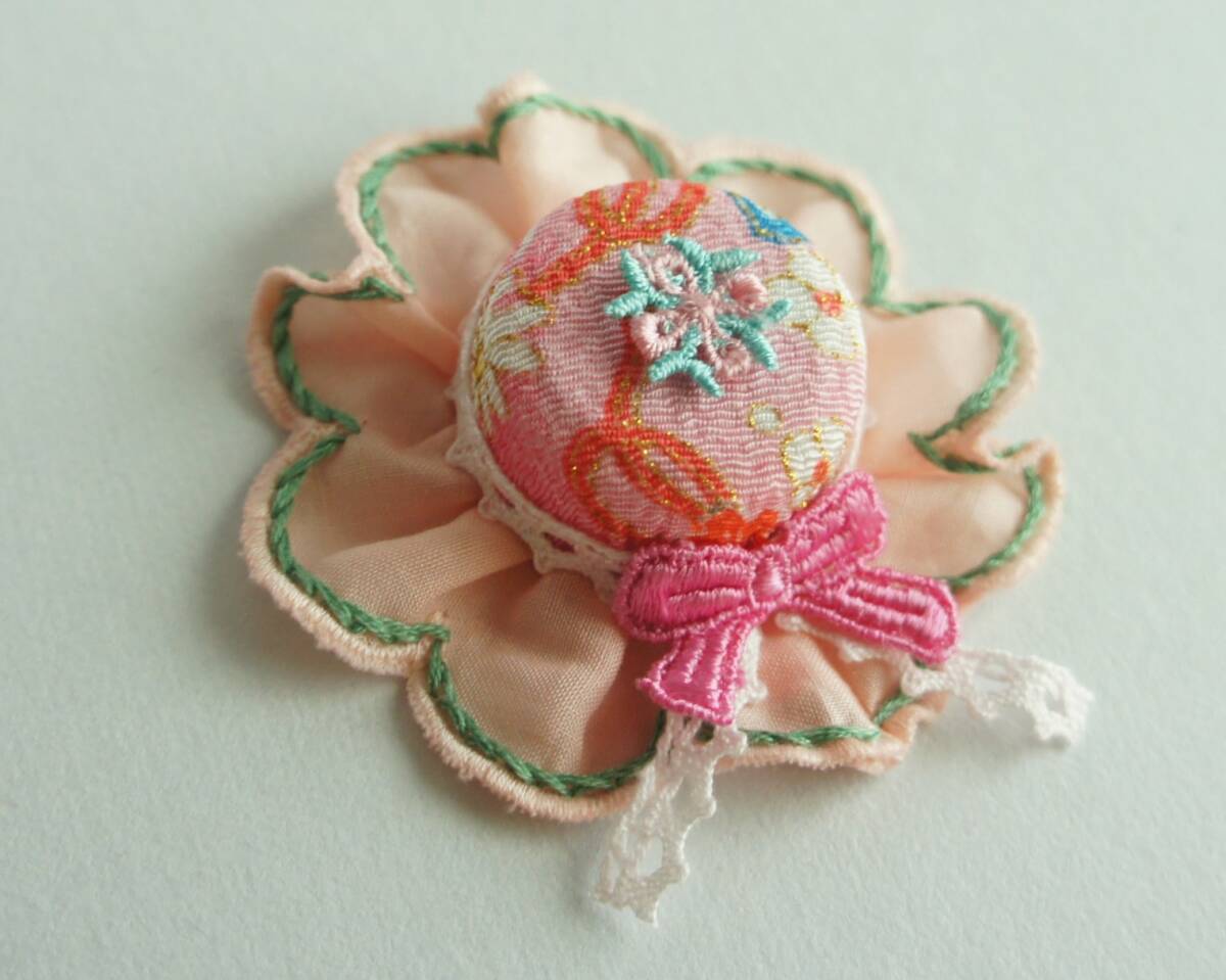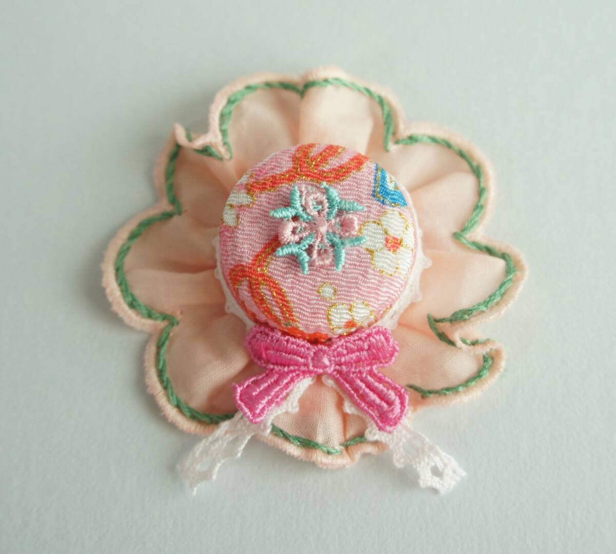 ハンドメイド  帽子 ブローチ レースにラインステッチ  縮緬  リボンのモチーフ トーションレース