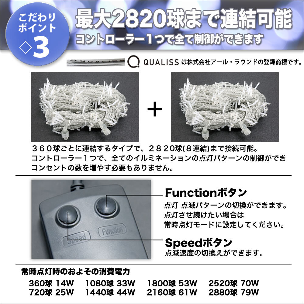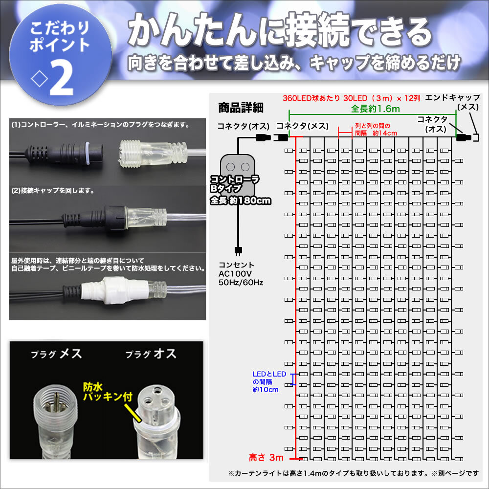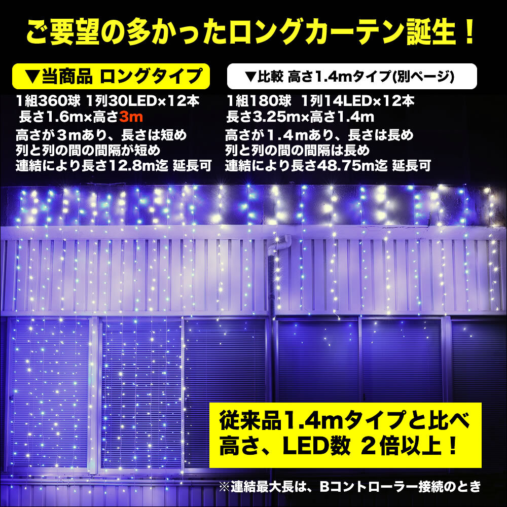 | ブルー 720球 長さ3.2m 点滅28種類 Bコントローラー 付 ![]() 最近は、LEDイルミネーションも各社が販売しており、 会社はもちろん、自宅等にもイルミネーションを飾り付けするケースも増えてきました。 イルミネーションで、木、庭、クリスマスツリー 等をライトアップでき、 明るく印象を変える事ができます。 最近は、価格安いイルミネーションも増えていますが、 品質面に不安を感じた事はありませんか? 「防水性能がしっかりしておらず壊れた…」 「LEDの明るさが暗い…」 「コントローラーの作りが簡素で不安」 等々で、失敗されたお客様、 品質にこだわったイルミネーションを使ってみませんか? 当社のイルミネーションは、購入してから 安心してお使い頂く為に、 とにかく品質面にこだわった商品です。 こだわりのポイントをご紹介いたします。 ![]() ![]() ![]() ![]() ![]() ![]()