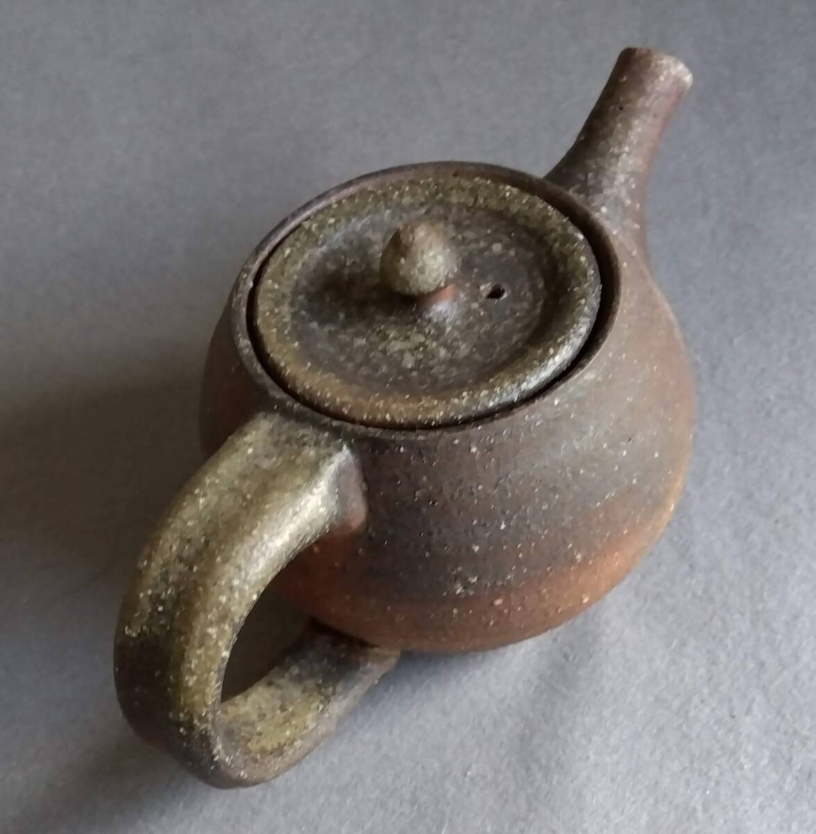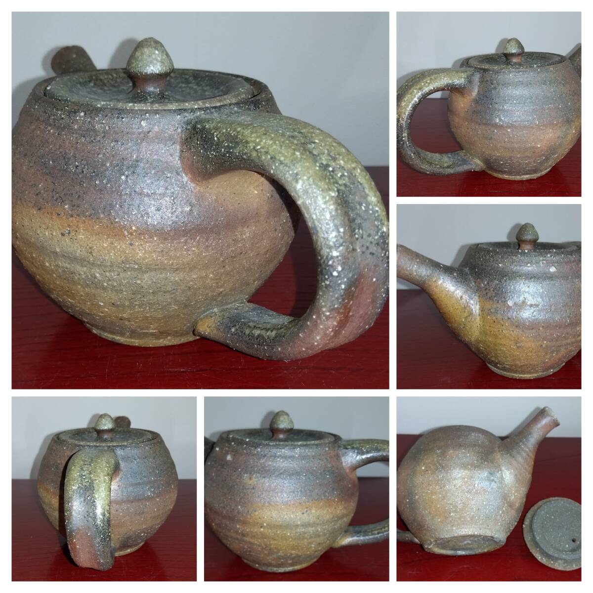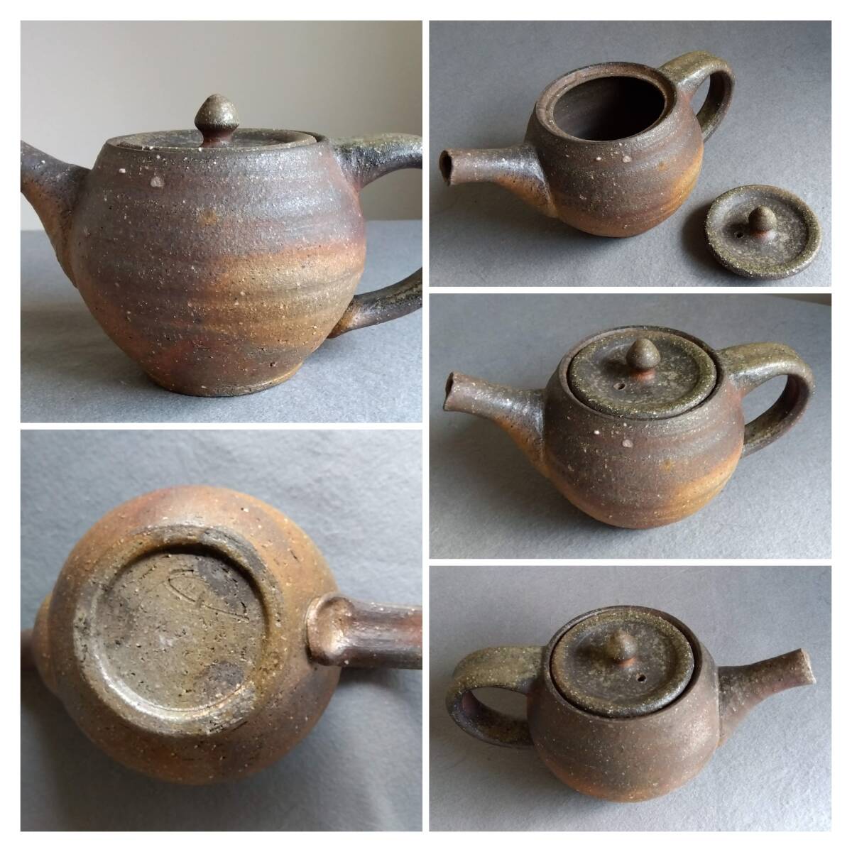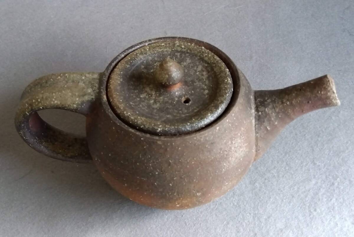 越前焼名工 松井勝彦 【青ノ木窯】 自然灰釉の究極美が迸る逸品灰釉美横手(よこで)急須 師の芸術審美観が日本伝統陶磁の世界で凝縮された逸品です。 師の卓越したろくろへら使い「至高の技」のもと「還元窯変美」「自然灰釉美」に一元化し越前焼魅力の世界を再確認させてくれます。 鉄分多く含み茶褐色に焼きあがる還元炎の輪廻の色彩を表す素朴な温かみある肌触りを持つ越前陶土「青ねば・赤べと・太古土」を最大限活かす形で作られています。 越前(陶土)が表す独特の質感を最大限に活かす【石ハゼの妙】【灰被り】が「還元窯変美」「自然灰釉美」に三位一体化に組み合わされ斬新で魅力あふれる世界を創出しています。日常生活道具雑器を超えた師の斬新なデザイン造形観審美眼が垣間見られ 心和む風趣を醸し出し 注がれたお茶の味わいを別次元へと誘ってくれます。サイズ: 注ぎ口10X40mm持ち手幅径20/30mm蓋部口径75mm見込み深さ80mm全高/蓋込み高105mm 蓋つまみ部30㎜ 高台厚/径5X60mm 包装:クラフトボックスプチプチ包装 出品者覧の【出品中の商品を見る】より 他にも多数の作品を出しておりますので御参照してください。 同梱可能ですので宜しくお願い致します
