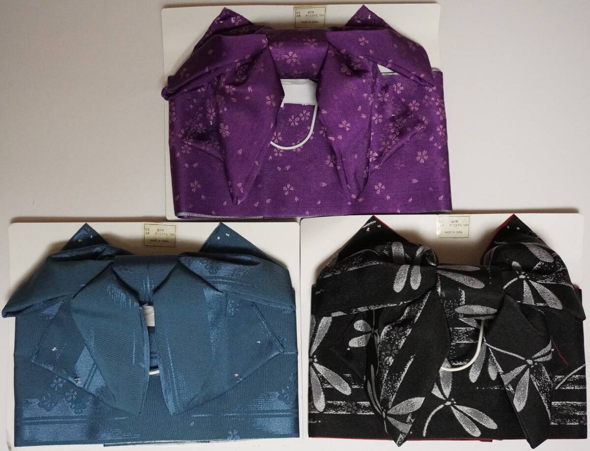 女性yukata用、地紋柄結び帯 紫系(濃淡はありません) x1、青灰x1、くろx1(3点セット )ポリエステル 新品(波状の写りはレンズの光学的ないたずらで現品にはありません、また薄く濃く写っている場合もあります)、胴部--帯巾約16,5cmx長さ約140cm、リボン部は横に約30cm。見た範囲で汚れないと思いますが、着用に差し支えない薄汚れなど(多分ない?)はあってものお値段で出品です。