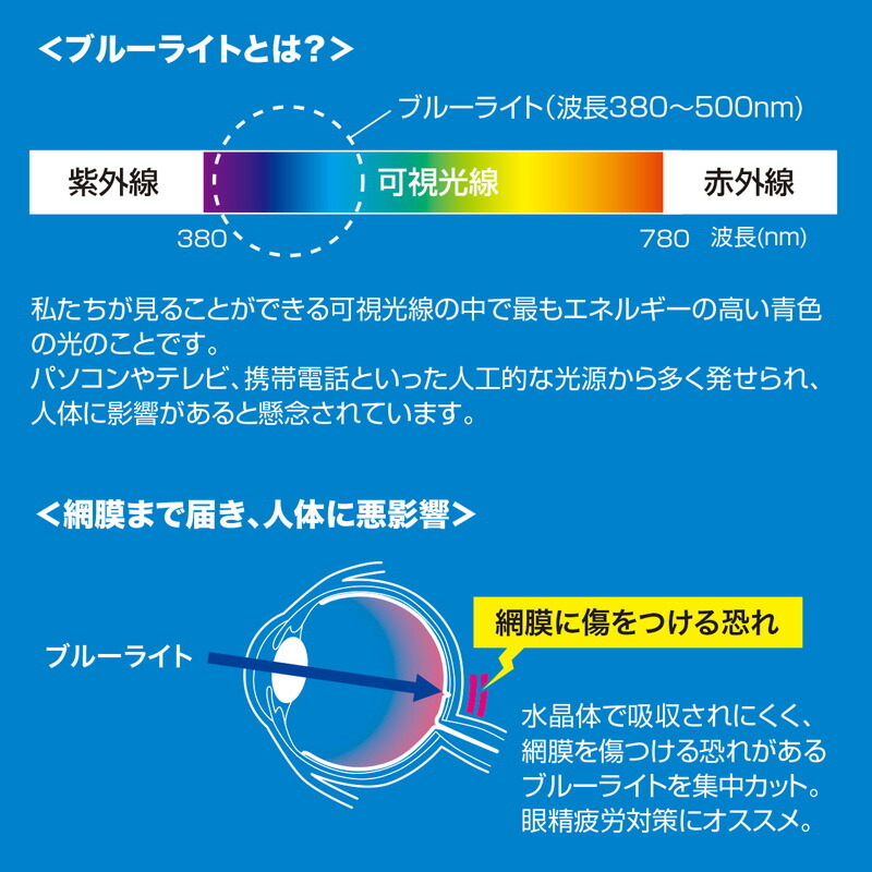 ●目の水晶体で吸収されにくく、網膜を傷つける恐れがあるブルーライトを集中カットします。眼精疲労対策にオススメです。