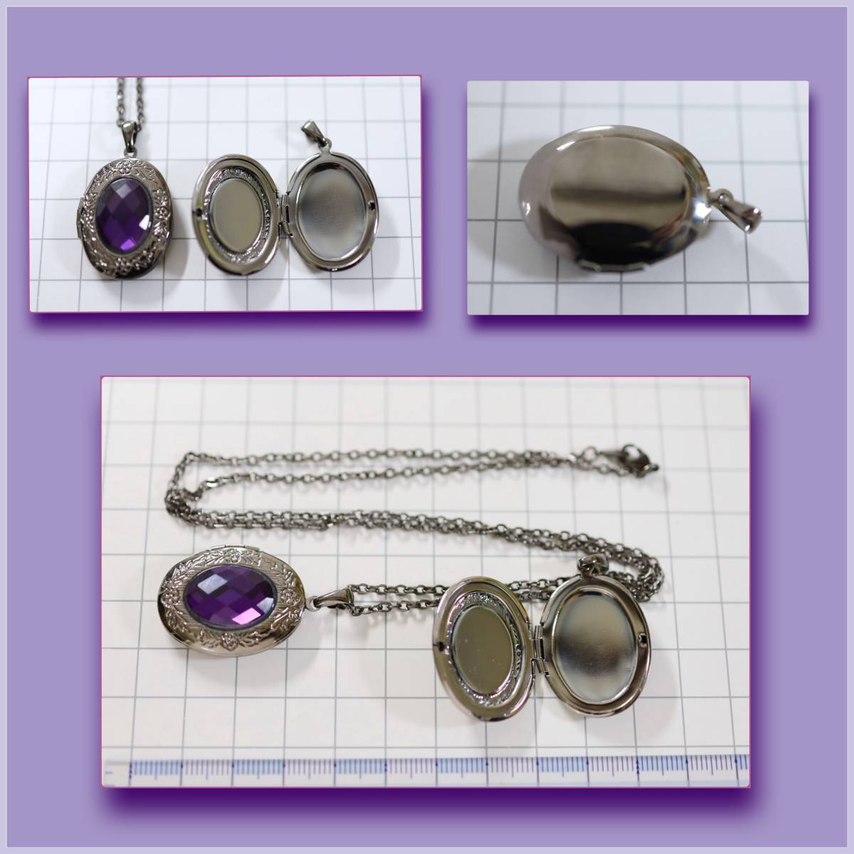 N7910/紫色 パープルカラー ネックレス ロケットペンダント ブラックチェーン オーバル 楕円 ガンメタ 黒 メンバーカラー 推し色