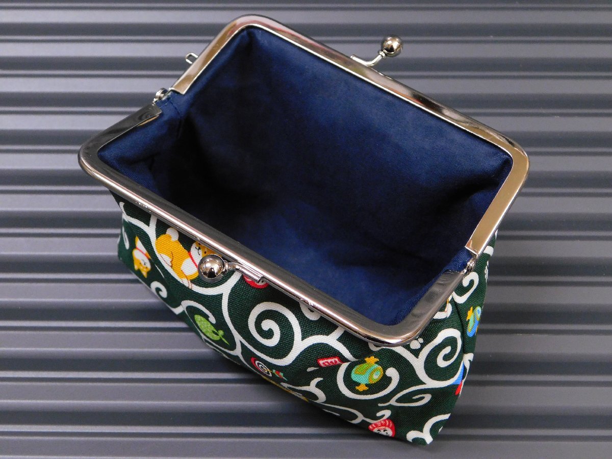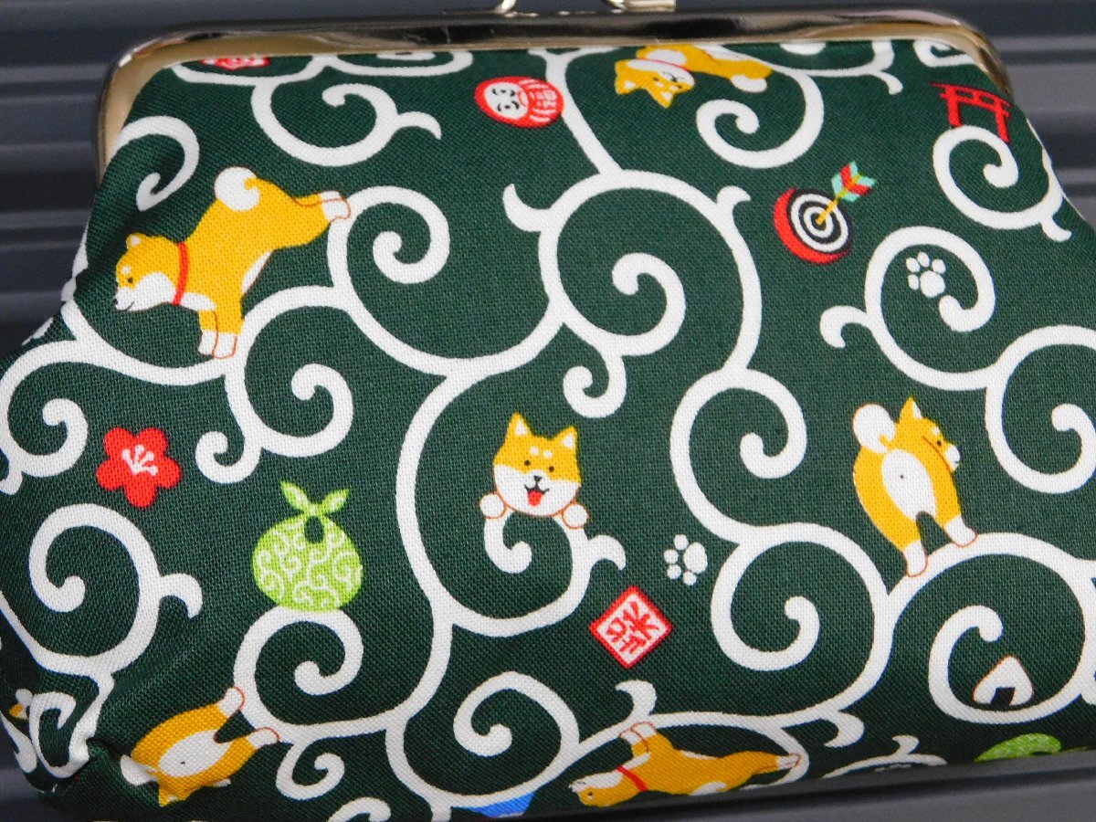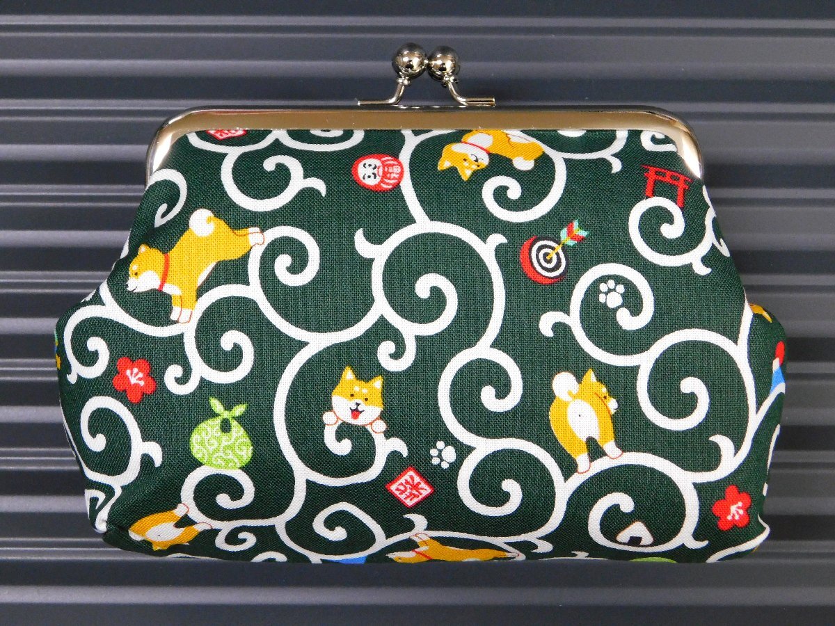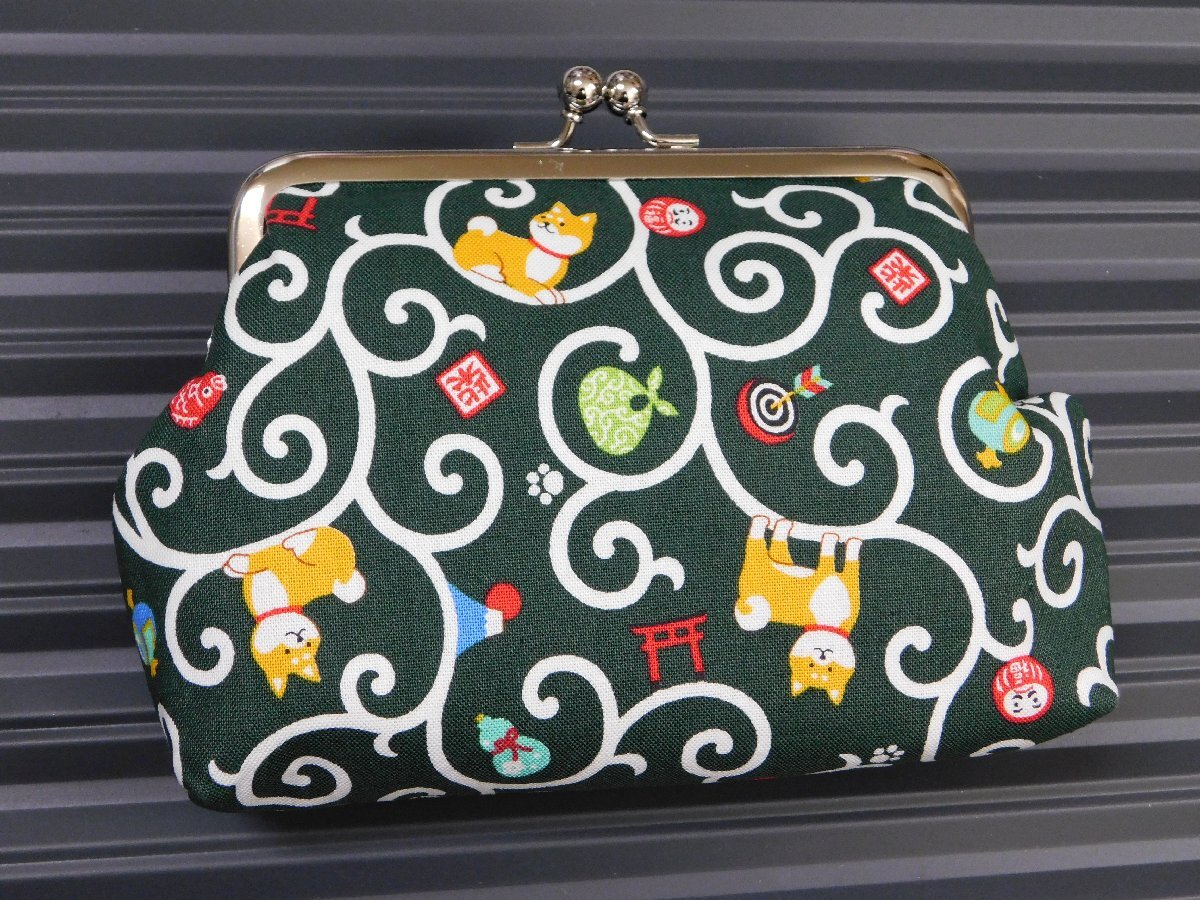 送料\140【4寸マチ付き がま口ポーチ】《柴犬・緑 グリーン》 小物入れ ポーチ がまぐち 唐草模様 わんちゃん