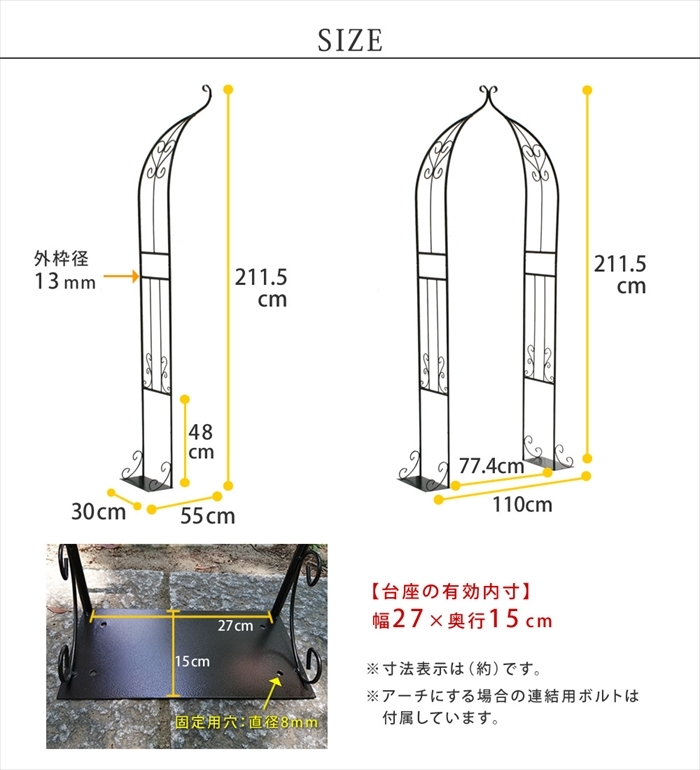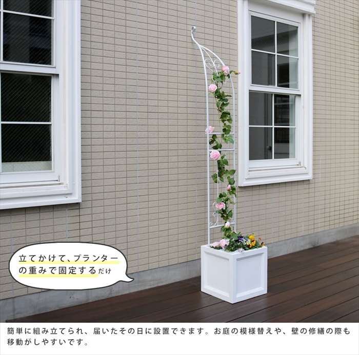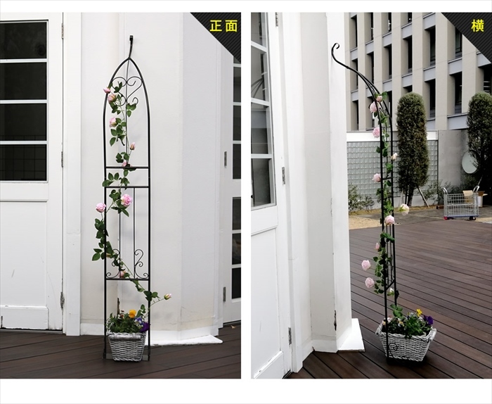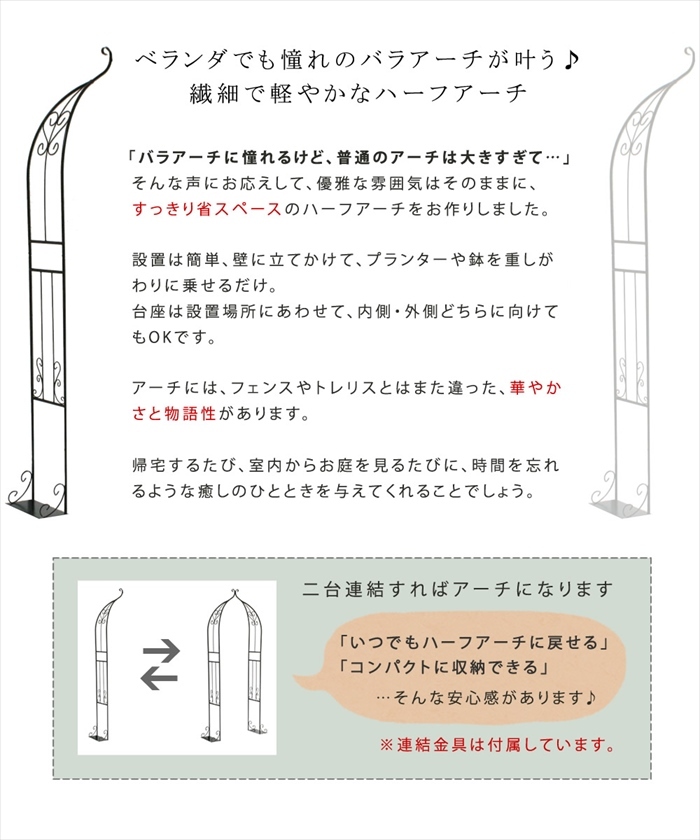 | ベランダでも憧れのバラアーチが叶う♪ 繊細で軽やかなハーフアーチ。 「バラアーチに憧れるけど、普通のアーチは大きすぎて…」 そんな声にお応えして、優雅な雰囲気はそのままに、すっきり省スペースのハーフアーチをお作りしました。 設置は簡単、壁に立てかけて、プランターや鉢を重しがわりに乗せるだけ。 台座は設置場所にあわせて、内側・外側どちらに向けてもOKです。 アーチには、フェンスやトレリスとはまた違った、華やかさと物語性があります。 帰宅するたび、室内からお庭を見るたびに、時間を忘れるような癒しのひとときを与えてくれることでしょう。 |