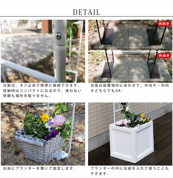 | ・重量物のハンギングはできません。 ・多層階でのご使用はお避けください。 ・スチール製のガーデン商品の性質上、ごくまれに部分的に錆びが発生している場合があります。 ・フェンスに登ったり、もたれかからないでください。転倒の恐れがあります。 ・台座の上にプランター等を置くことで固定できますが、あくまで簡易固定です。土の上やコンクリート上にしっかりと固定したい場合は、アンカー等をご用意頂き、加工や施工をして頂く必要があります。 ・入荷時期により、商品のデザイン・仕様が品質に差し支えない程度に予告なく変更される場合がございます。大きなデザインの変更はございませんが、ご注意ください。 |