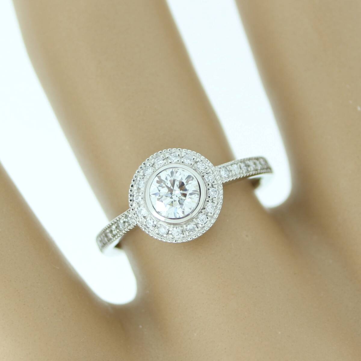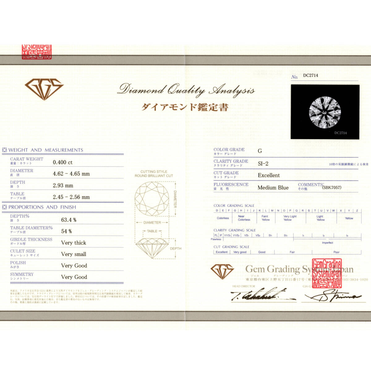 通常店頭にて0.4ct以上の中石を使用しD,E,F,Gカラーと最上位から4番目の大変キレイなGカラー!