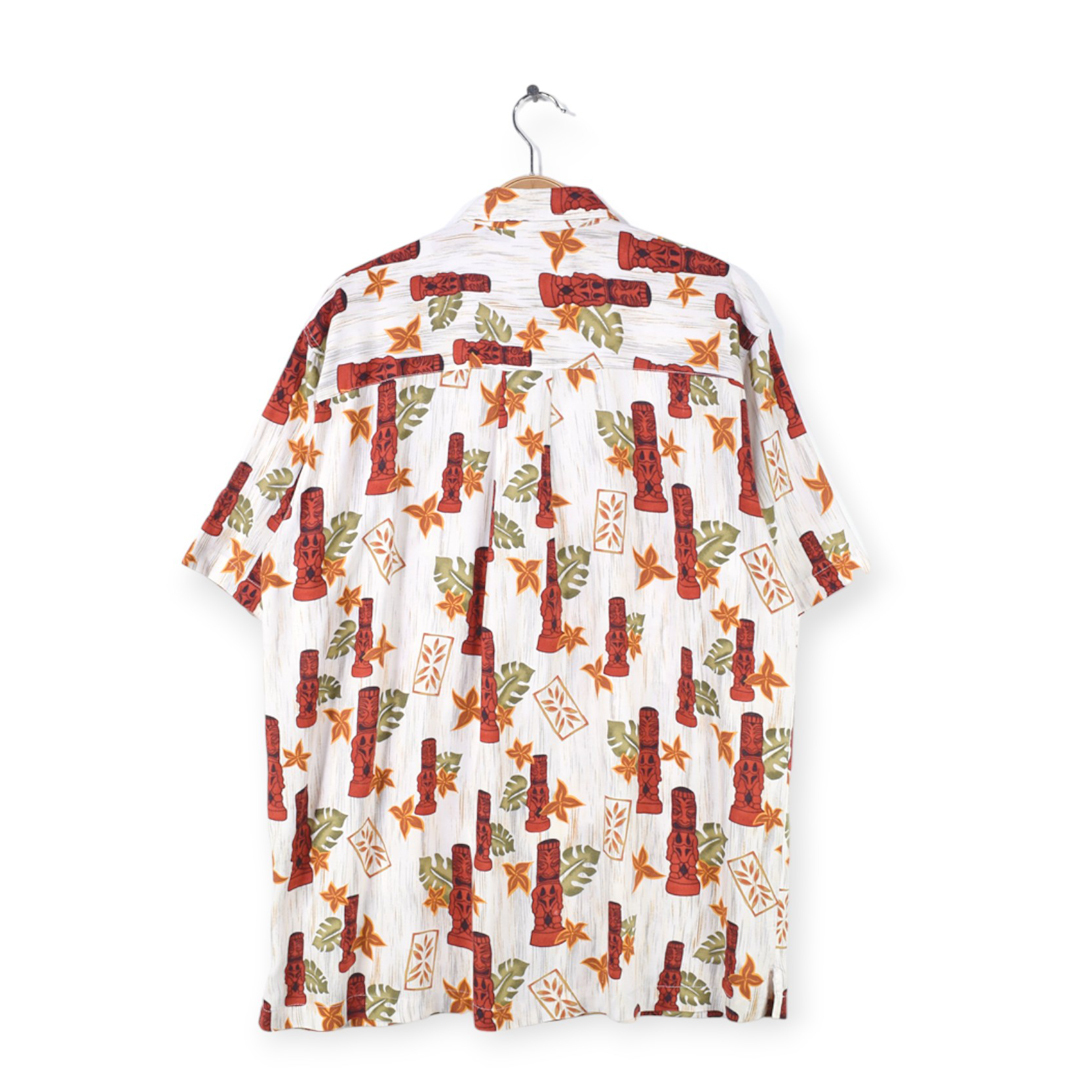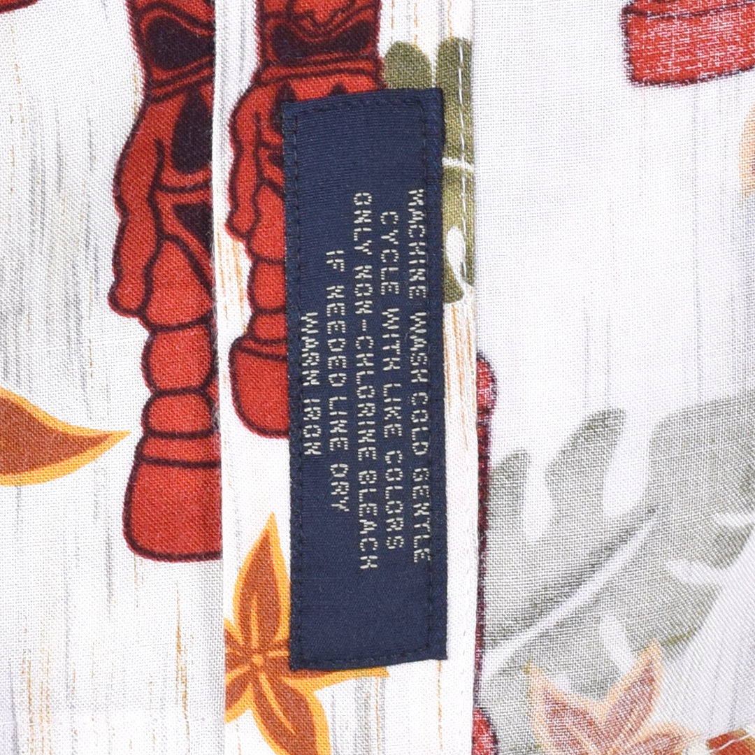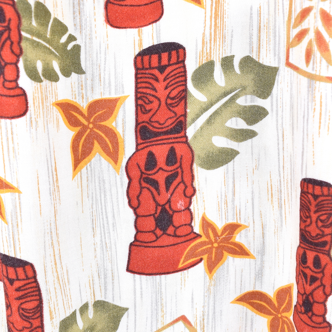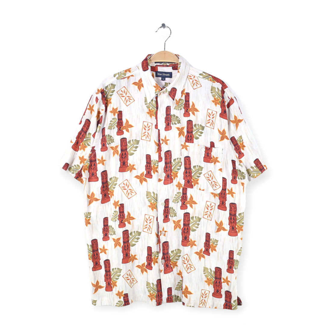 【送料無料】MARK EDWARDS アロハシャツ レーヨン ティキ柄 ハワイの神像 ハワイアンシャツ 総柄 サイズM 古着 @CD0130