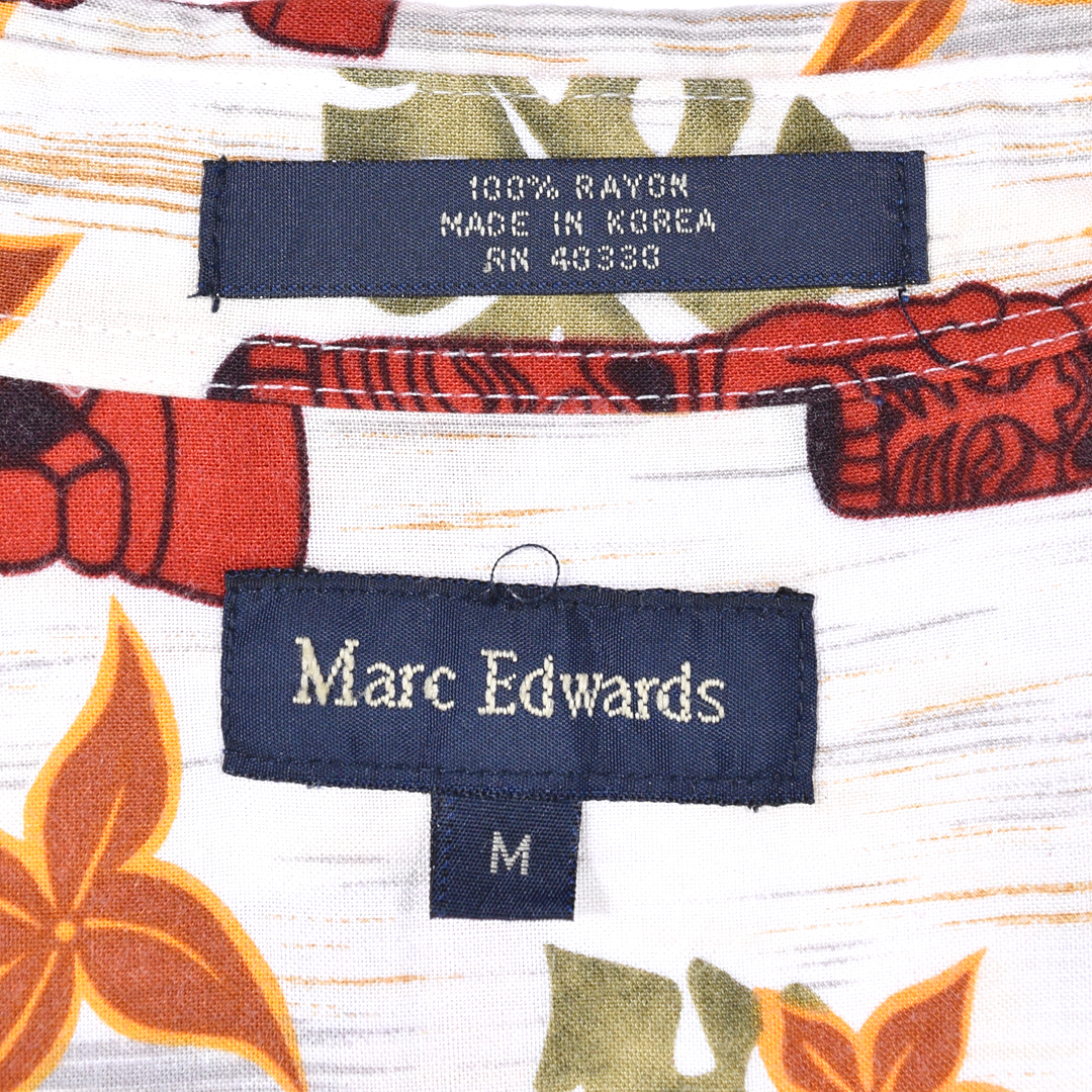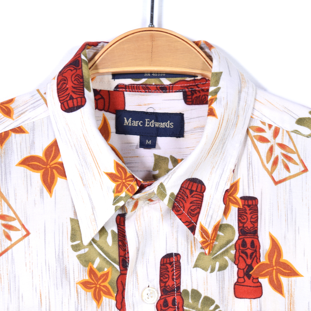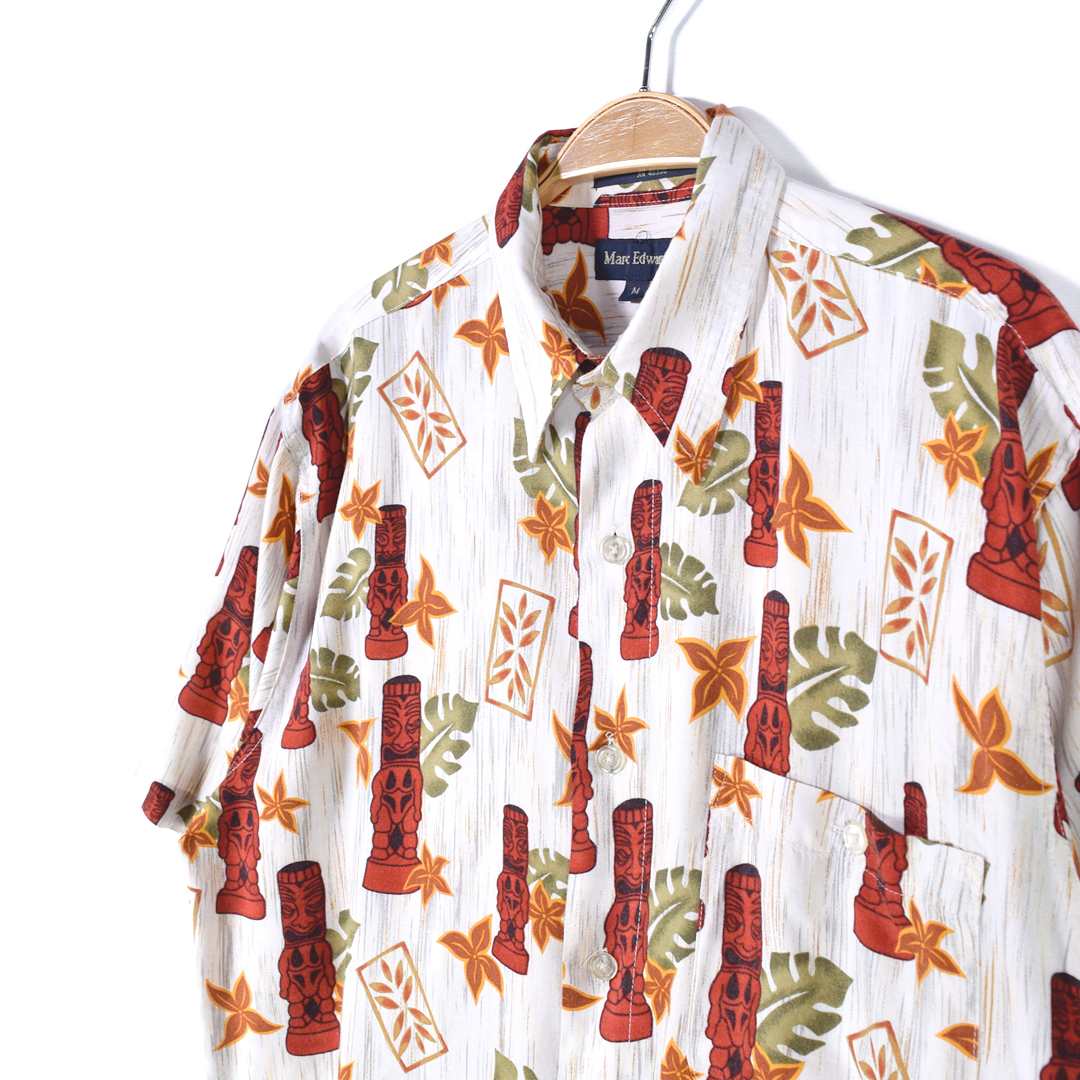 MARK EDWARDS アロハシャツ レーヨン ティキ柄 ハワイの神像 ハワイアンシャツ 総柄 サイズM 古着 @CD0130