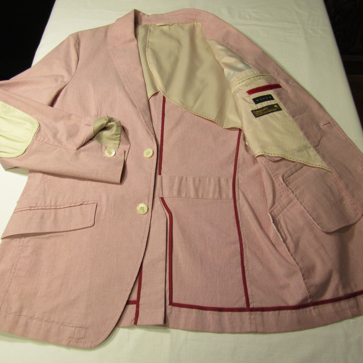 | 感度の高い大人に向けたカジュアルブランド「VUMPS」 日登美(株)の展開する百貨店ブランドです。 さわやかなカジュアルジャケットです。 生地はサラリとしたコットン素材。ポリウレタンが2%混ざっておりますので、ストレッチ性があります。 スペイン製の高品質生地です。 裏地は背抜き観音仕様で肩パッドなしの軽快な仕立てとなっております。 メンズ・コットンストレッチ・エルボーパッチ・テーラードジャケット/春夏 型番:3915-5050 シングル段返り3つボタン/センターベント/裏地-背抜き観音仕様/肩パッドなし/腰ハッキングポケット/左にチェンジポケット(チェンジポケットの中は塞がった状態です。)/エルボーパッチ(合成皮革) |
