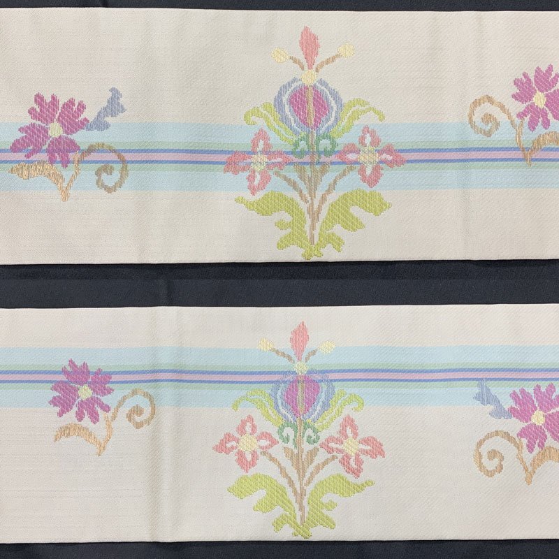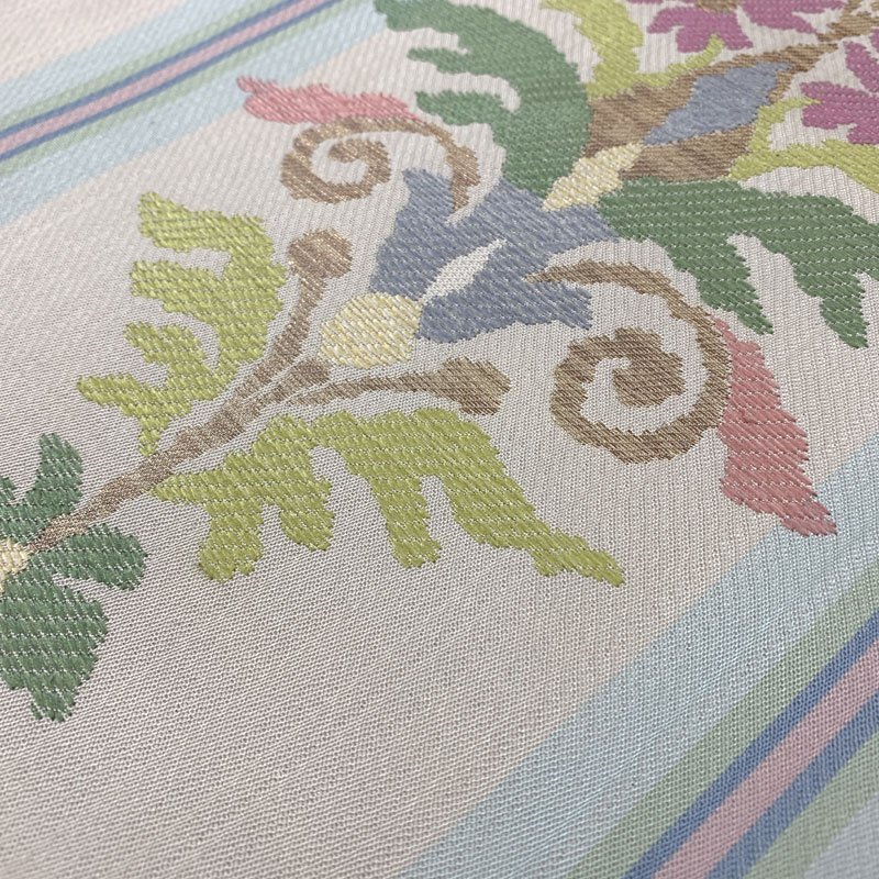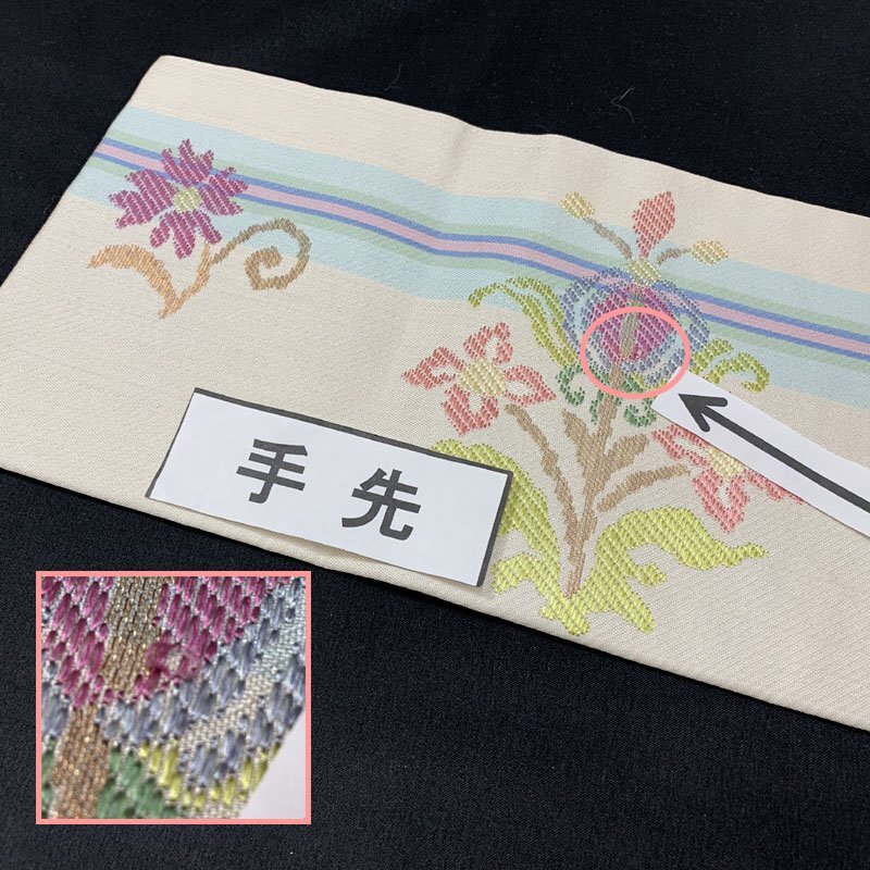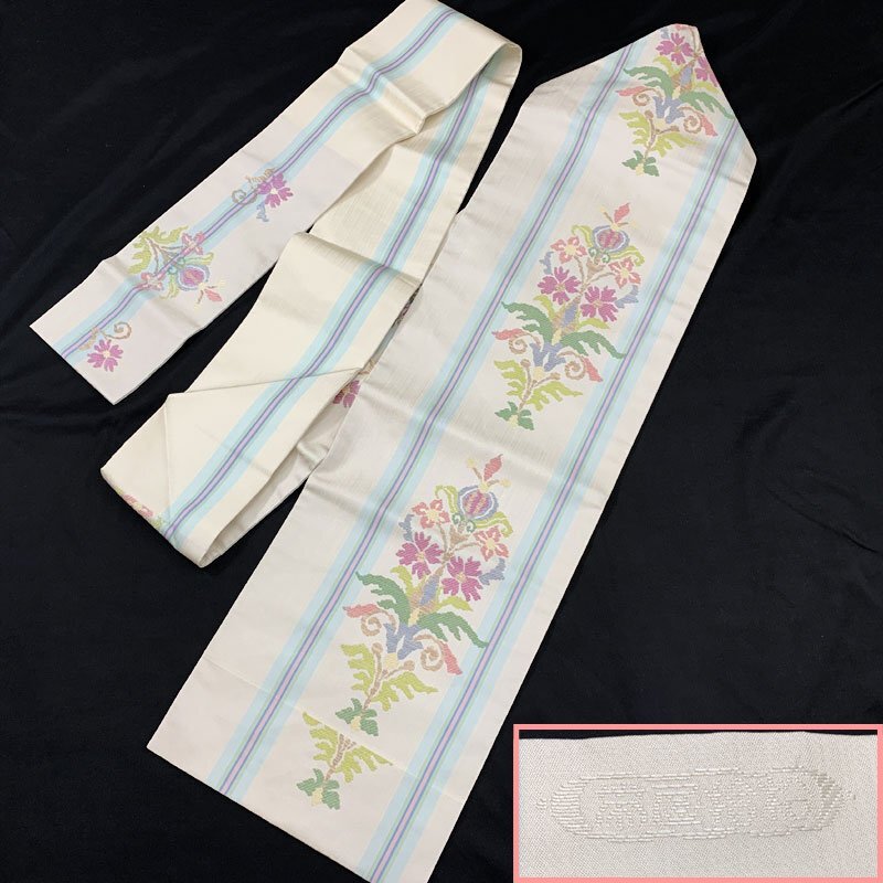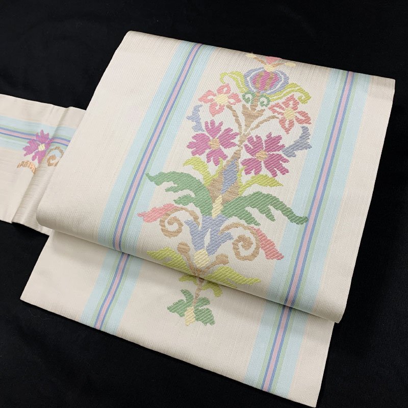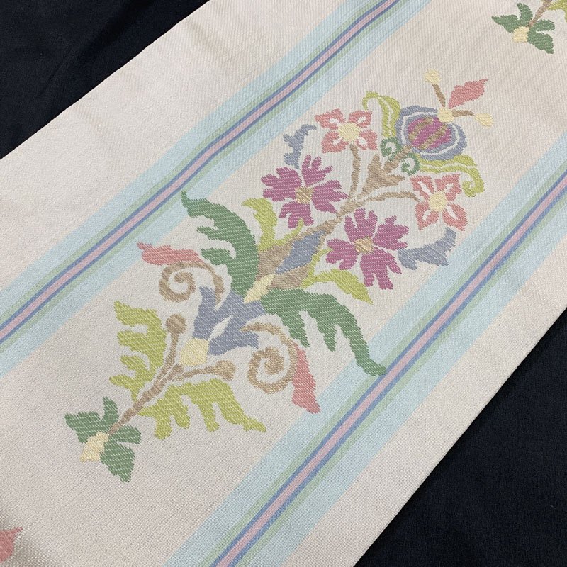 ◇帯屋捨松 エキゾチック 唐花 縞 名古屋帯◇美品 (No.gld) 帯屋捨松謹製の九寸名古屋帯です。もてなしや趣き、思いやりや遊び心やゆとりなど、「あしらい」を持って創られる捨松の帯。こちらの名古屋帯はさわやかな水色やピンクの縞の間に異国情緒のある花が織り出されています。細い銅色の金糸がさりげなく煌めきます。 手先にわずかな糸の飛び出しがございます。その他、大きく目立つようなシミ・ダメージもなく美品です。 【素材】正絹 【色】白・パステル系多色 *モニターによって色味は実際と異なる場合がございます。 【サイズ】幅:31.3cm、長さ:368cm *素人採寸のため、多少の誤差はご容赦ください。 上質な逸品ですので、いかがでしょうか?よいお品物でお勧めです^^ |