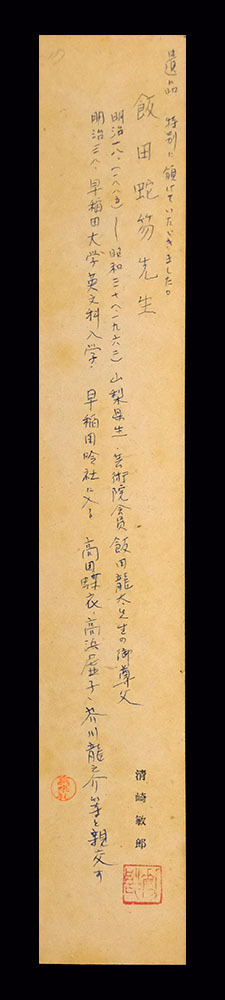 紙本肉筆未装短冊1葉(色地金箔金砂子散料紙) 作品寸法:36.2cm x 6.0cm 紙背に清崎敏郎蔵印及び自筆書込み 商品状態:非常に良好な保存の品です。 飯田蛇笏(いいだだこつ) 1885-1962。明治-昭和時代の俳人。明治18年4月26日生まれ。早大在学中に早稲田吟社で活躍。高浜虚子に師事するが,明治42年郷里山梨県境川村に隠棲(いんせい)。虚子の俳壇復帰とともに句作を再開,「ホトトギス」の中心作家となる。俳誌「雲母」を主宰,山間の地にあって格調のたかい作風を展開した。昭和37年10月3日死去。77歳。早大中退。本名は武治。別号に山廬(さんろ)。句集に「山廬集」「椿花(ちんか)集」など。 出典:講談社『デジタル版 日本人名大辞典+Plus』 清崎敏郎(きよさきとしお) 1922-1999。昭和-平成時代の俳人。大正11年2月5日生まれ。高浜虚子,富安風生に師事し,「ホトトギス」同人。昭和54年風生の没後は「若葉」主宰をつぎ,花鳥諷詠と客観写生の理念をつらぬいた。平成10年「凡」で俳人協会賞。母校慶大の講師,同大付属高教諭をつとめた。平成11年5月12日死去。77歳。東京出身。本名は星野敏郎。句集に「安房上総(あわかずさ)」「東葛飾(かつしか)」など。 出典:講談社『デジタル版 日本人名大辞典+Plus』 |