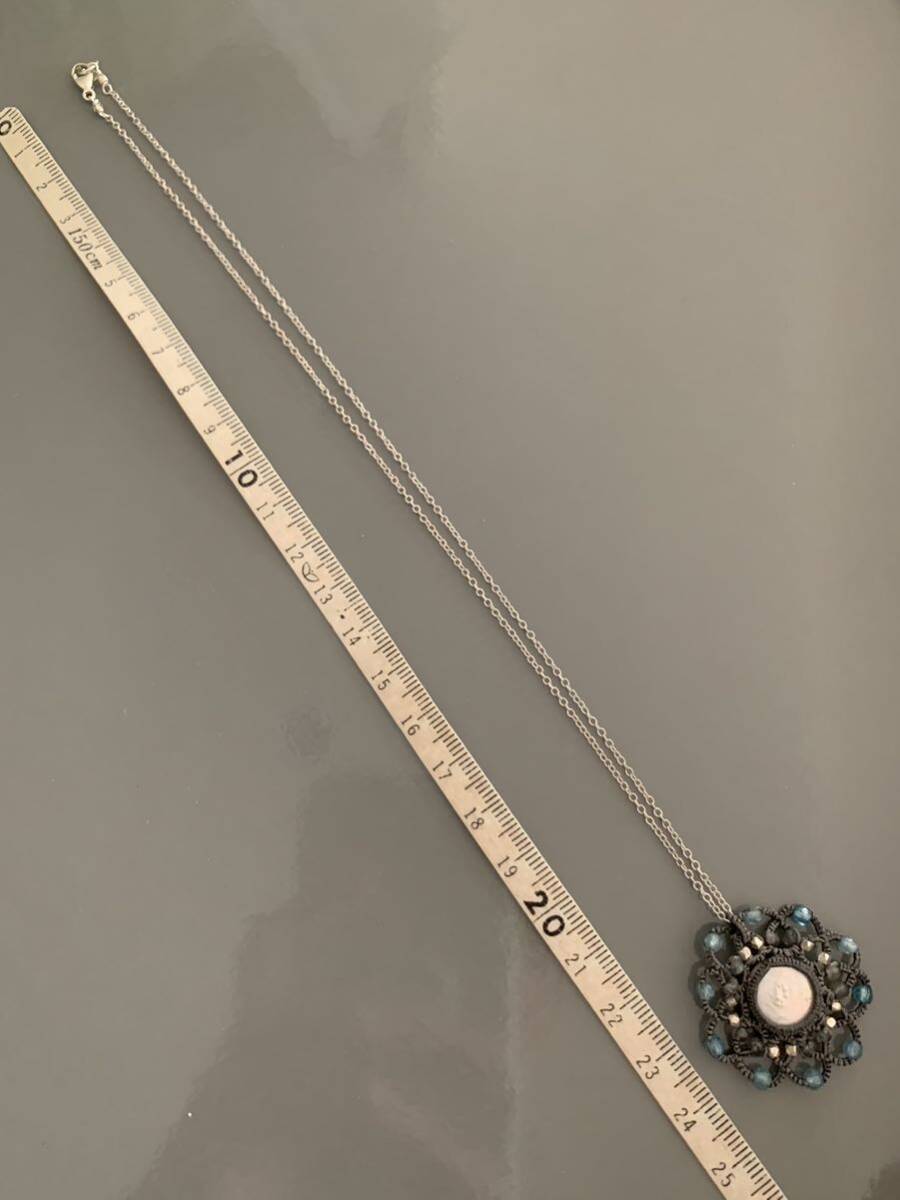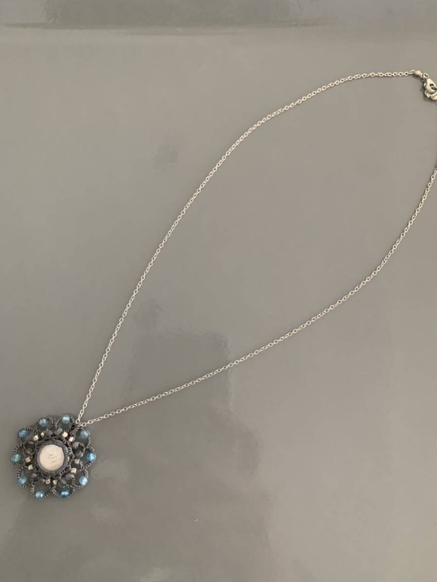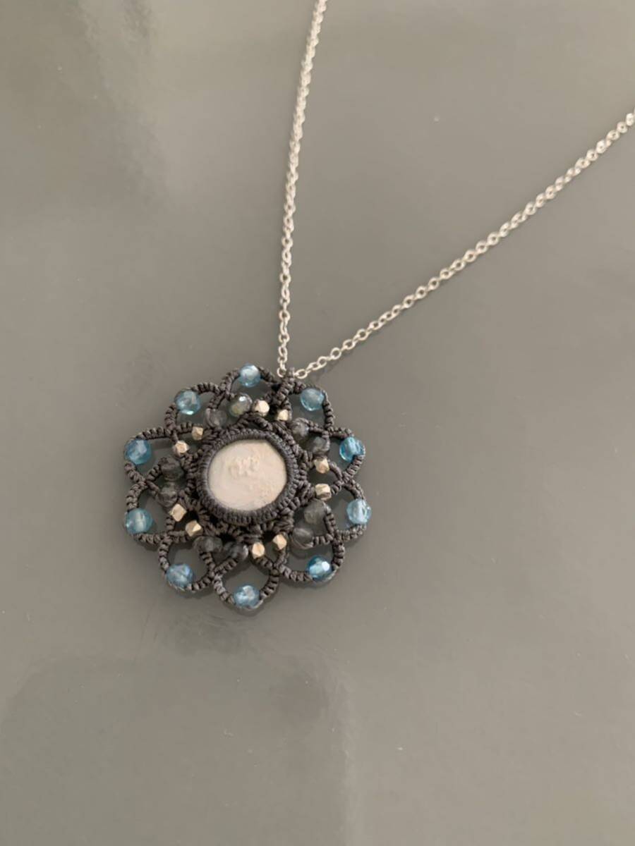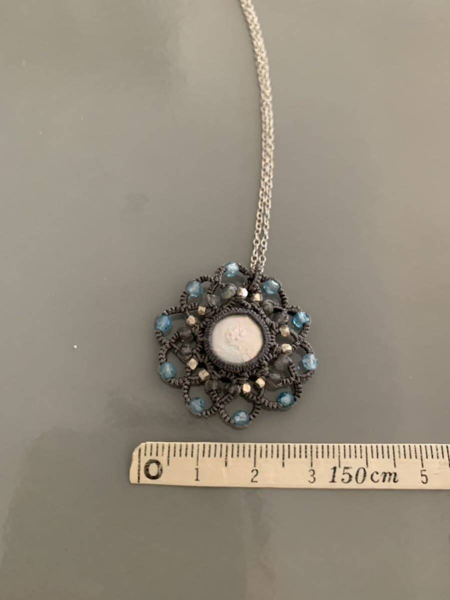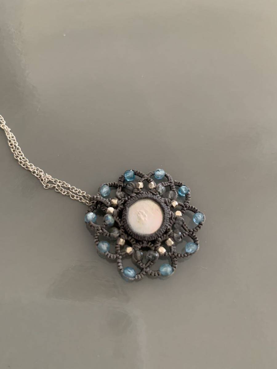 ロサンゼルスのデザイナーによるもので、スモーキーグレーのレース糸で編み込まれています。中央は淡水パールかと思うのですが、詳しくないので画像でご判断お願いいたします。上品なパールのピンクがかった輝きがあります。