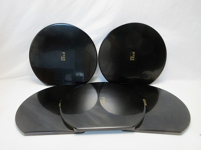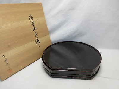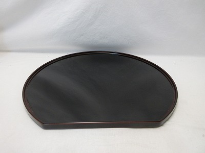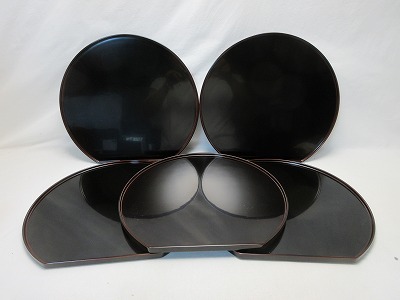 | J04728 【 美品 懐石道具 平安堂造 木製溜塗半月膳 5客揃 共箱 】 検) 茶道具 煎茶道具 和食器 会席膳 宴会盆 平膳 茶事 会席 銘々盆 ⅲ | ||||