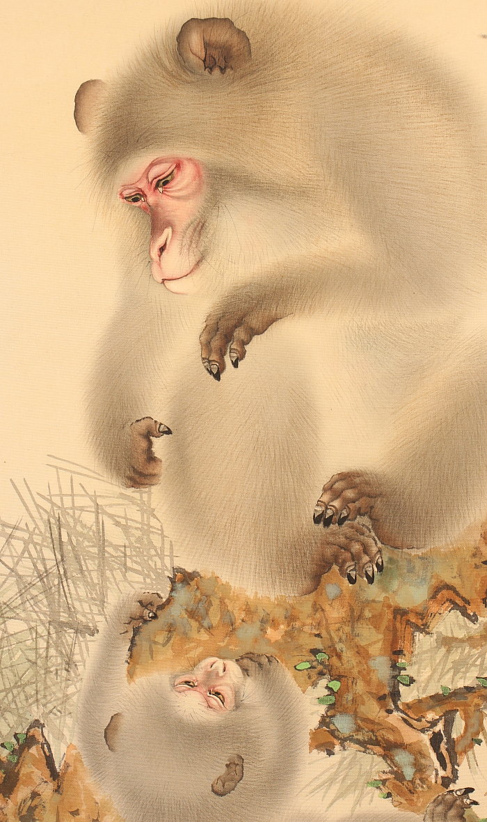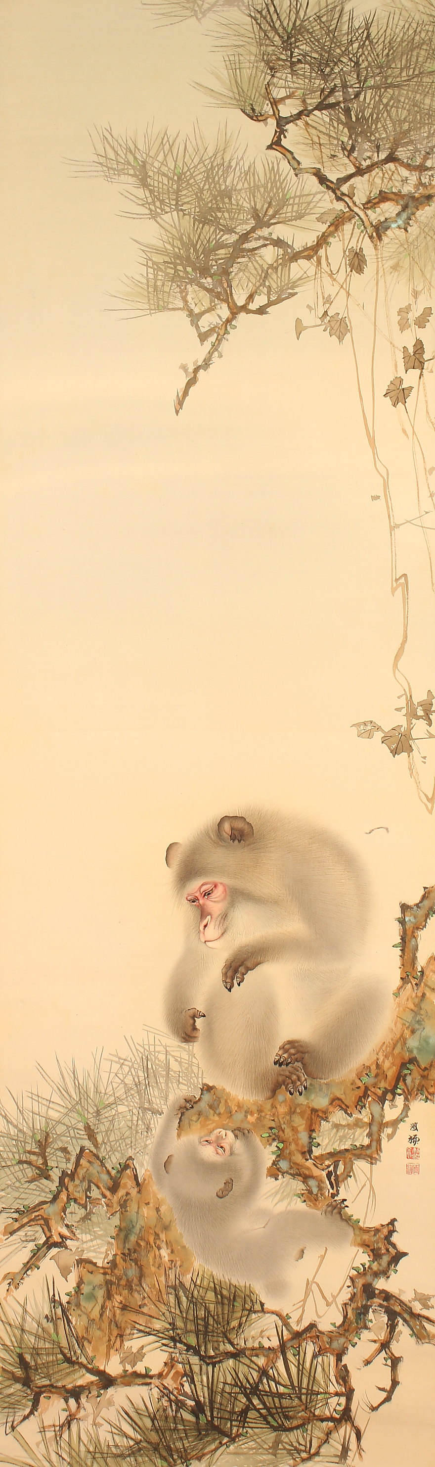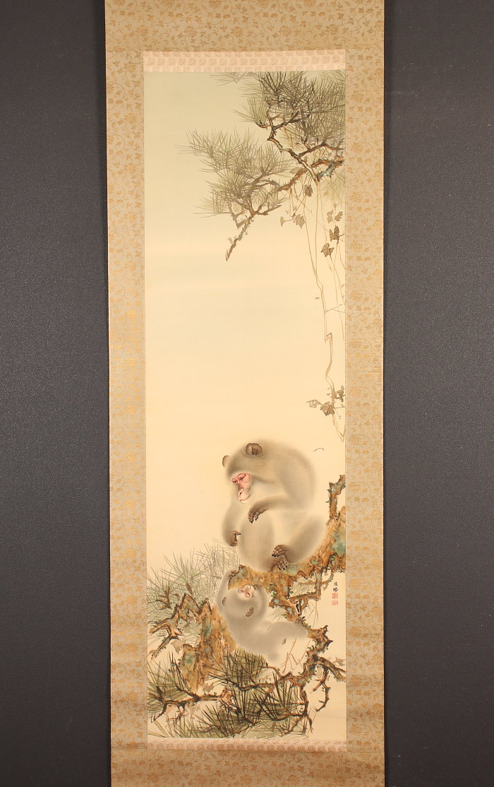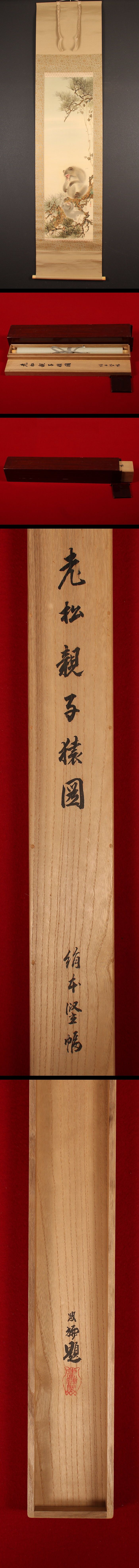 【真作】【伝来_弐】●dr2244〈吉村鳳柳〉老松親子猿図 共箱 二重箱 円山派重鎮 森二鳳師事 明治時代 大阪の人