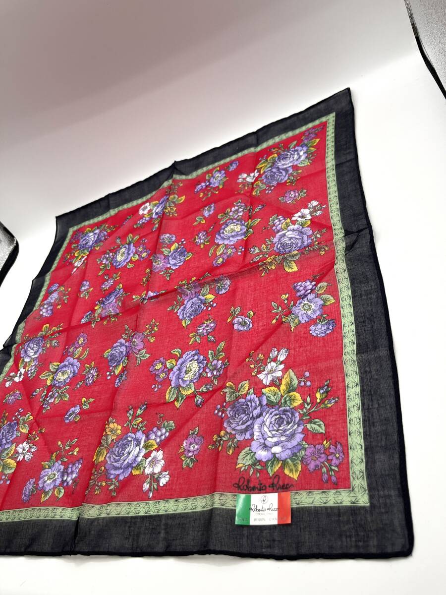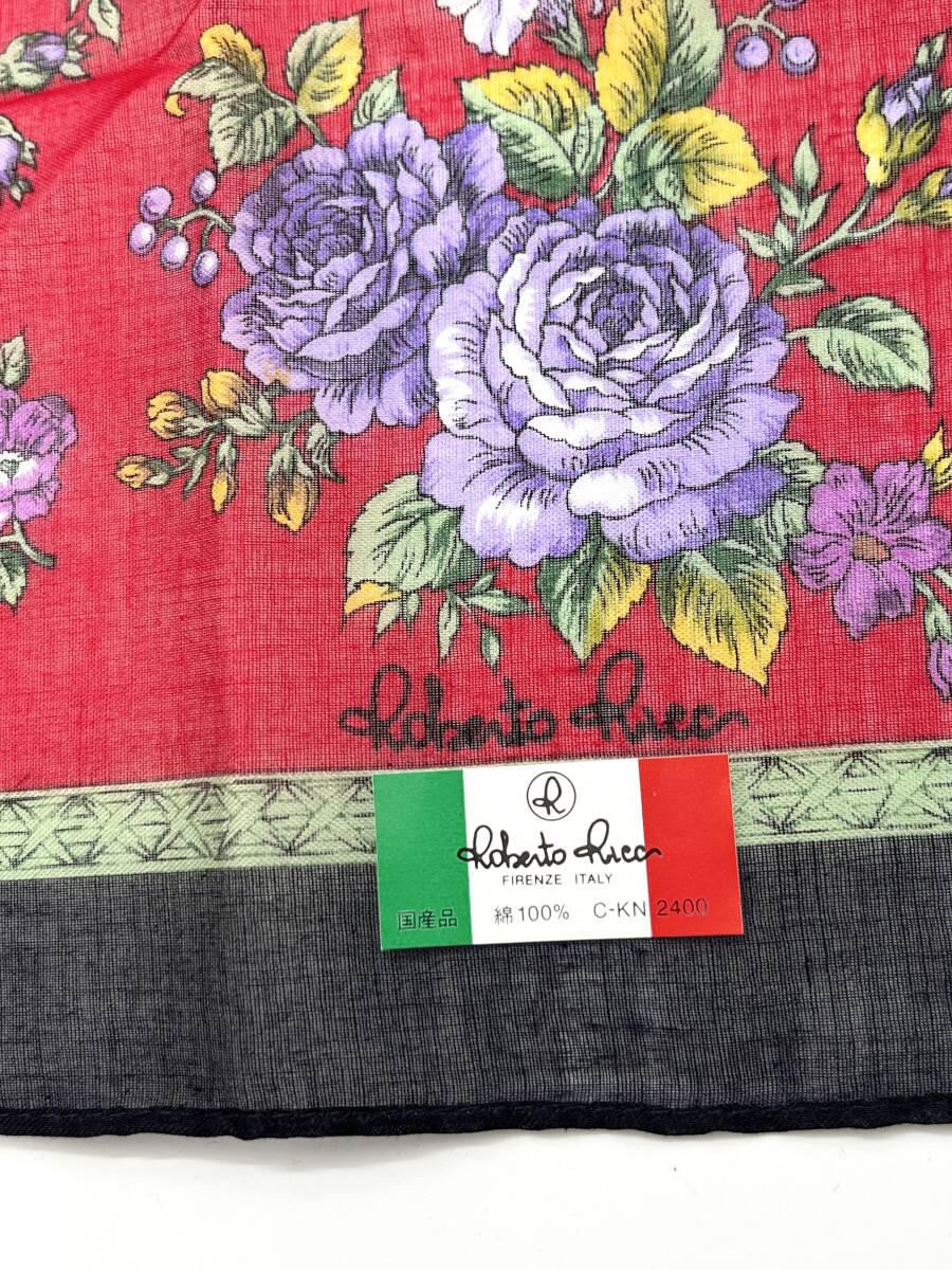 【未使用品】Roberto Riec ハンカチ バンダナ 花柄 フラワー レッド×パープル×グリーン 縁ブラック コットン 綿100% W45 H47