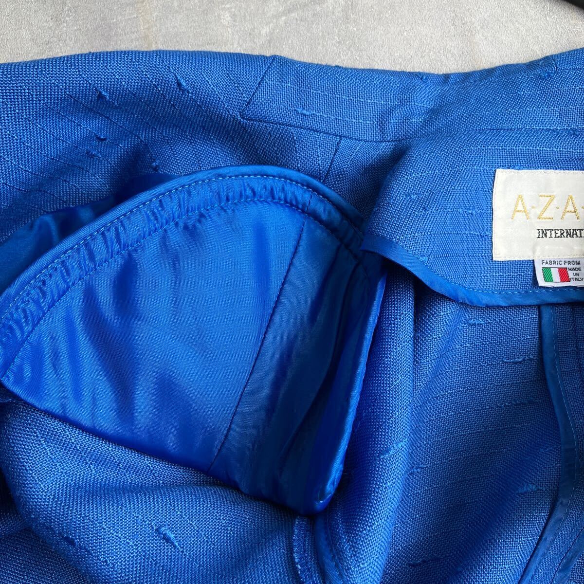 美品 AZABU 麻布十番 紬織のスカートスーツ 11号 ロイヤルブルー 半袖ジャケット タイトスカート イタリア製生地 春夏 レディース レトロ