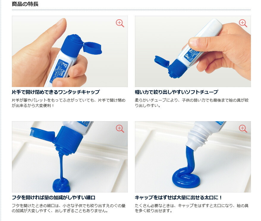 フタを開けたときの細口は、小さな子供でも絞り出すえのぐの量の加減が大変しやすく、出しすぎることもありません。