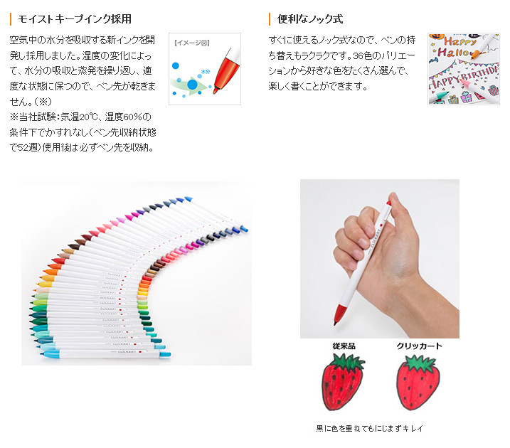 キャップをしなくても空気中の水分を吸収して乾燥を防ぐ新インク、「モイストキープインク」を開発し、ノックするだけで使うことができる水性カラーペンを可能にしました。