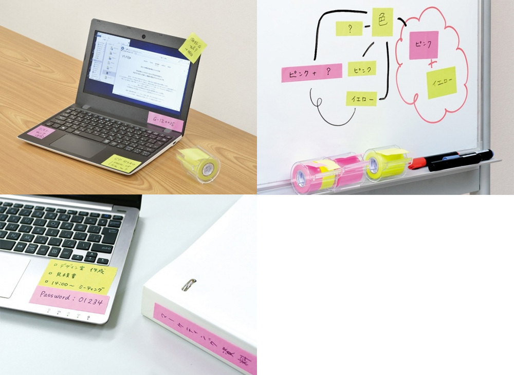 パソコンなどにもピタッと貼れて、きれいにはがせる全面粘着剤付の「メモックロールテープ強粘着」。ご家庭で、職場で、アイデアに合わせてお使いください。