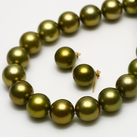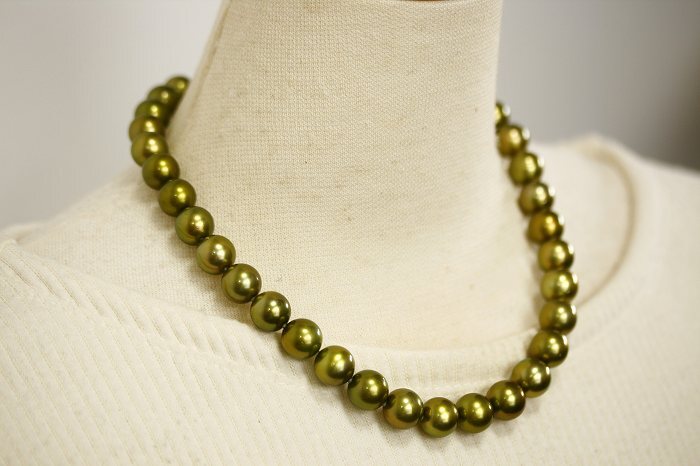 珍しいピスタチオ染めのタヒチ黒蝶真珠ネックレスです。 独特のグリーンが神秘的なオーラを漂わせています。 ここまでの珠数の色を合わせるのには大変作るのが困難な1本です。 巻きテリもとても綺麗な珠です。 キズは少し見られますが,着用時は目立たないものでございます。 サイズは12-11mmの存在感のあるサイズになっております。 定番色にはない独特のオーラをぜひ一度お試し下さい。 周りの人と差をつけるレアパールジュエリーです。 ペア珠(貫通珠)はイヤリングかピアスにお仕立てさせて頂きます。 | |