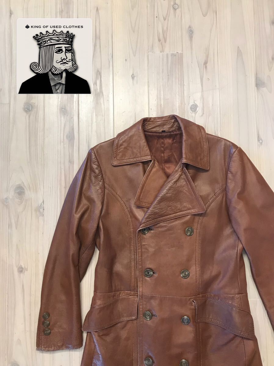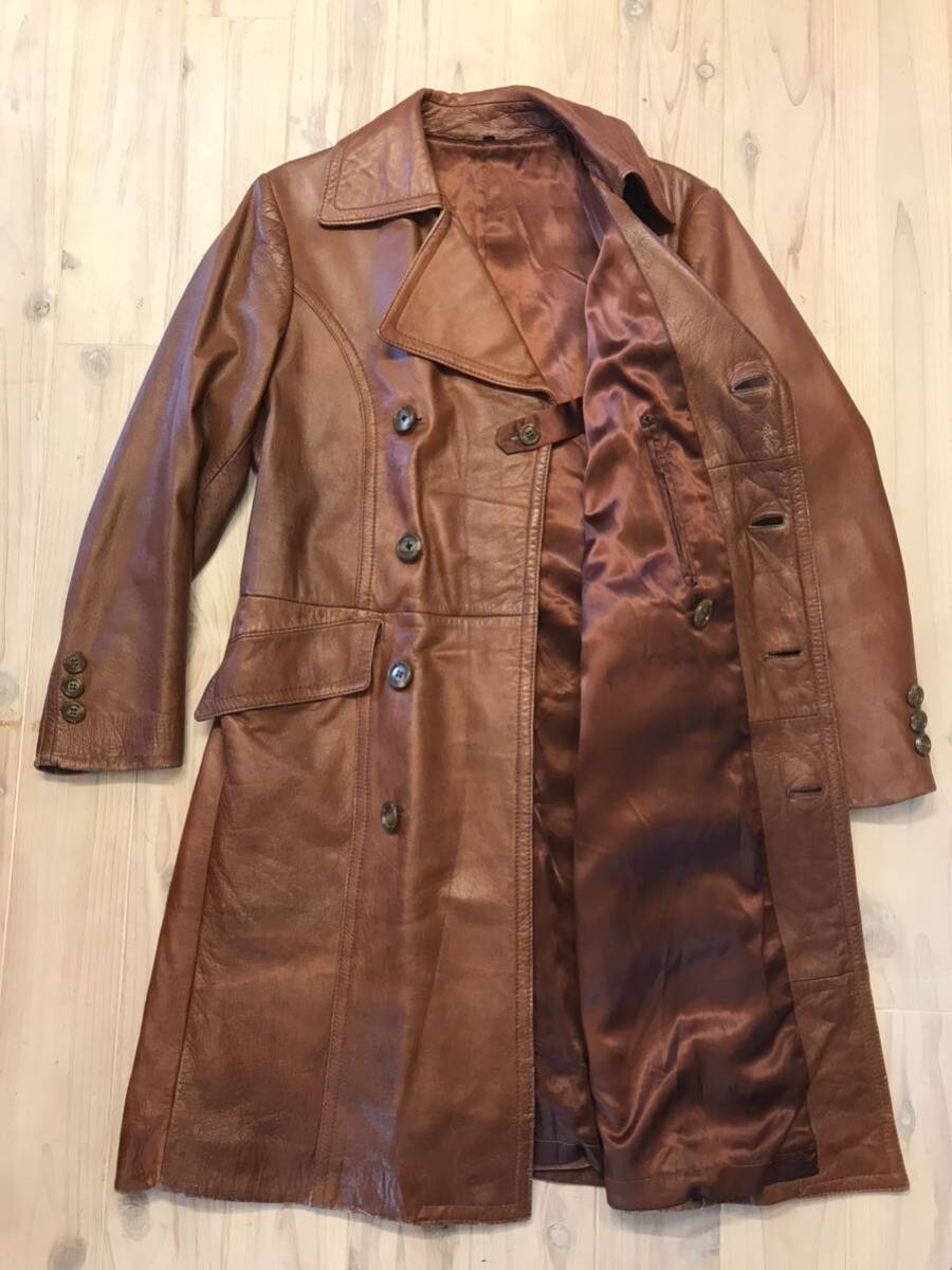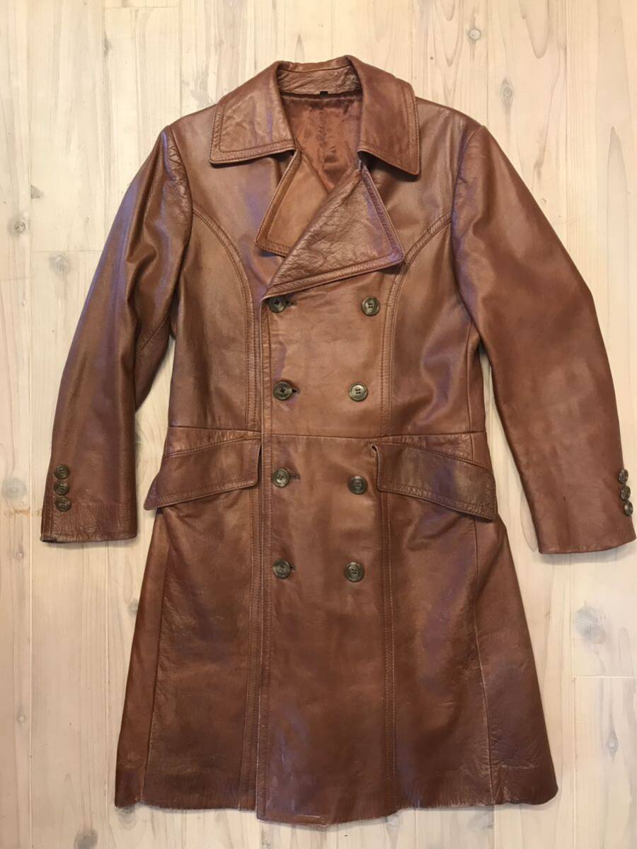 本革で色はブラウン、35年以上前に購入したものでビンテージ物です。多分80’s で当時でもフルレザーのコートは物が少なく即買いした記憶があります。