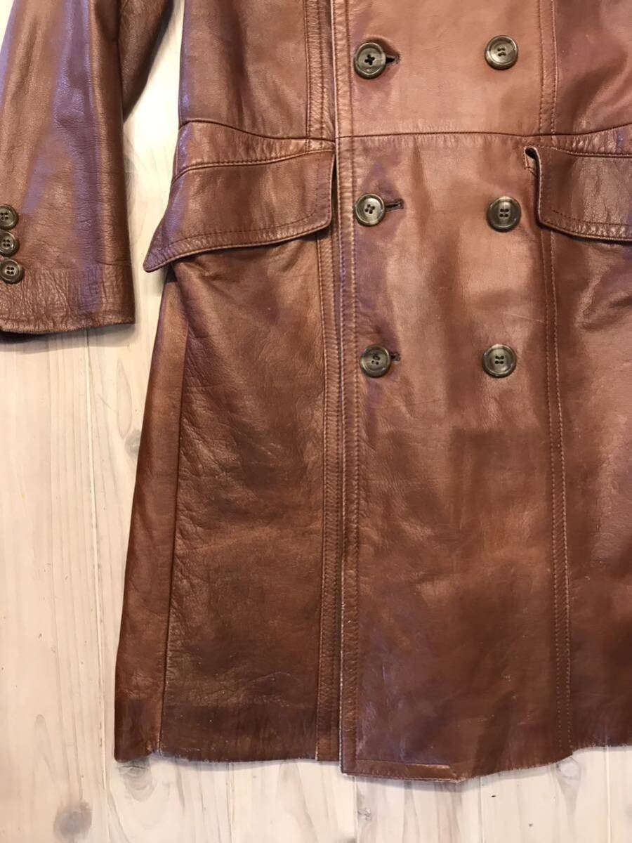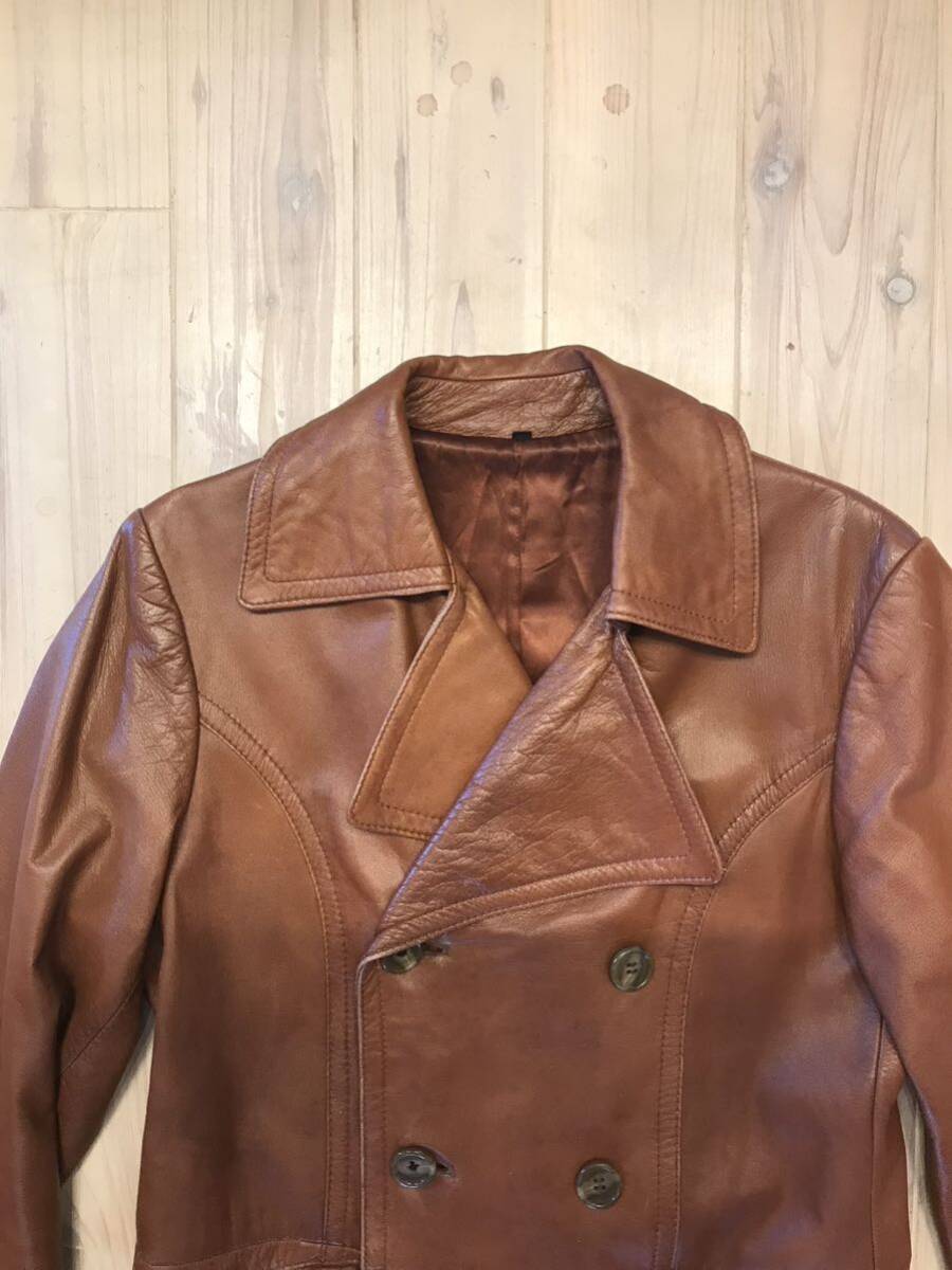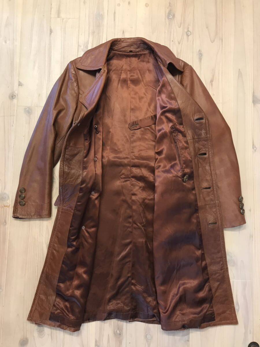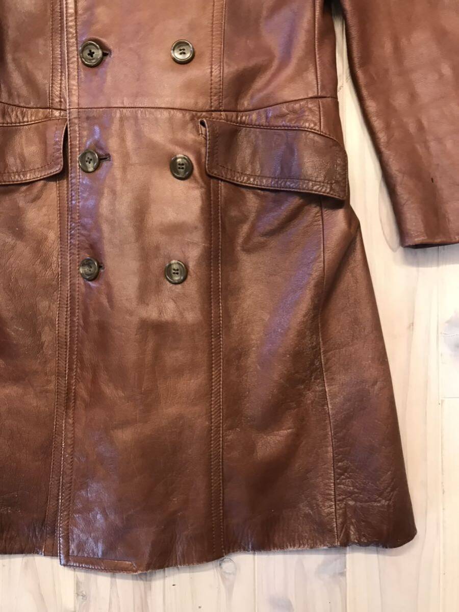 本革で色はブラウン、35年以上前に購入したものでビンテージ物です。多分80’s で当時でもフルレザーのコートは物が少なく即買いした記憶があります。