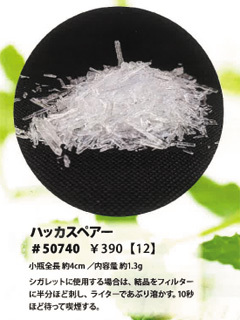 「シガレットに使用する場合は、結晶をフィルターに半分ほど刺し、ライターであぶり溶かす。10秒ほど待って喫煙する。」
