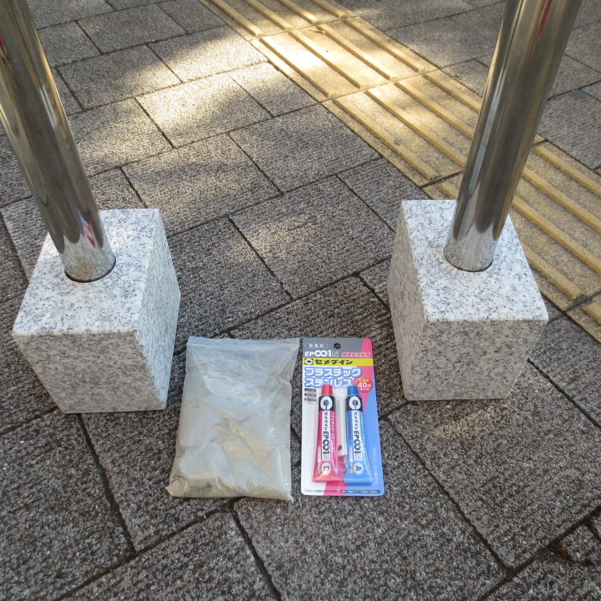 付属する「速乾60分セメント 水で混ぜるだけのセメント500g」と接着剤で固着してください。