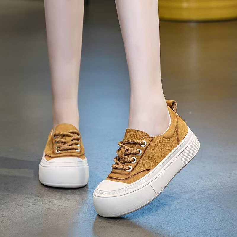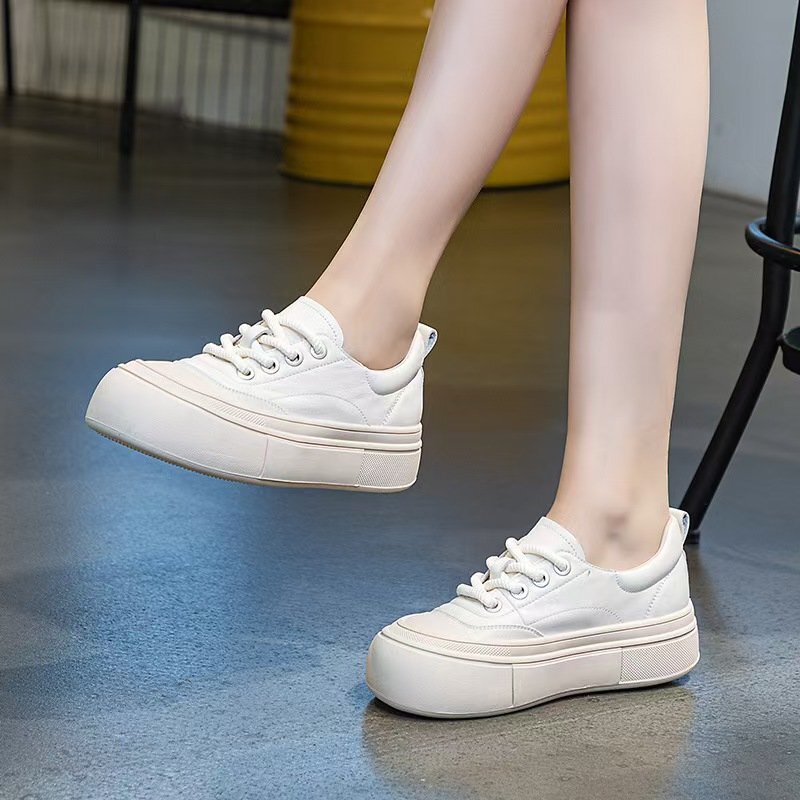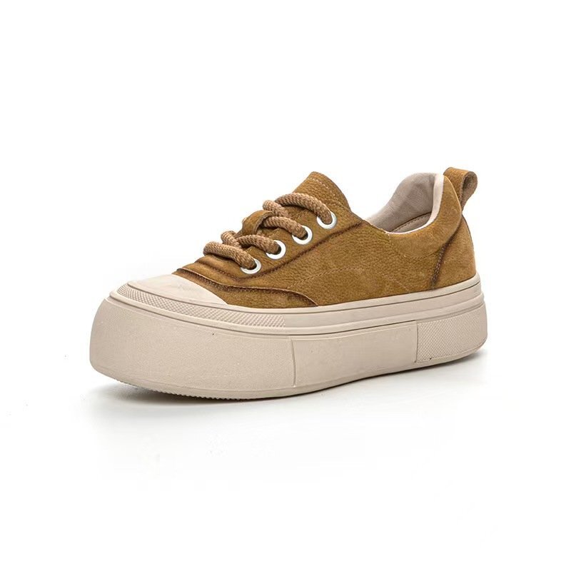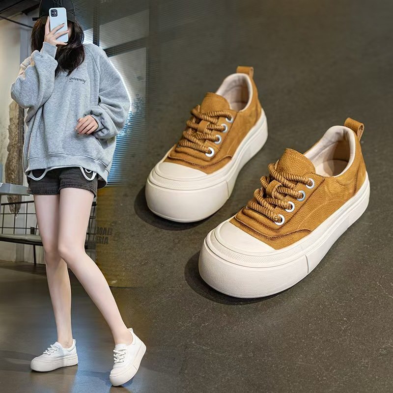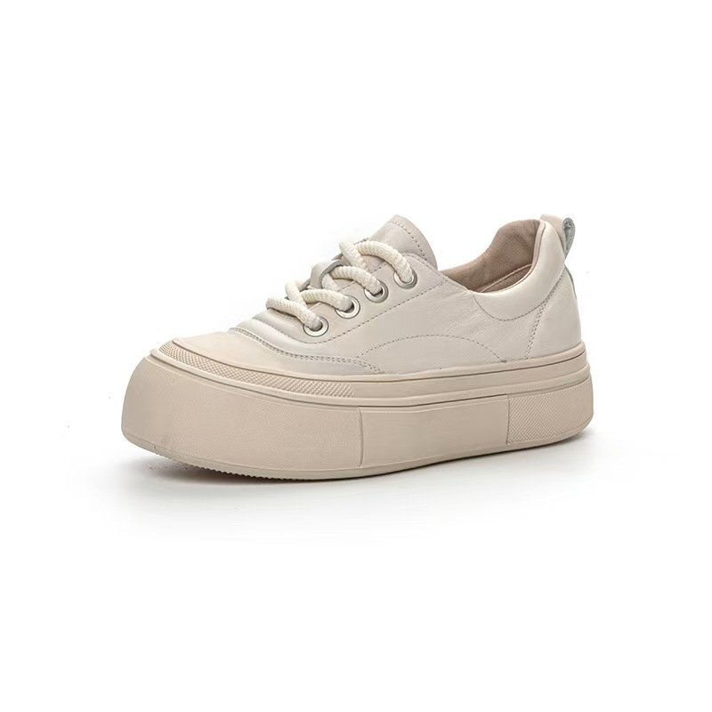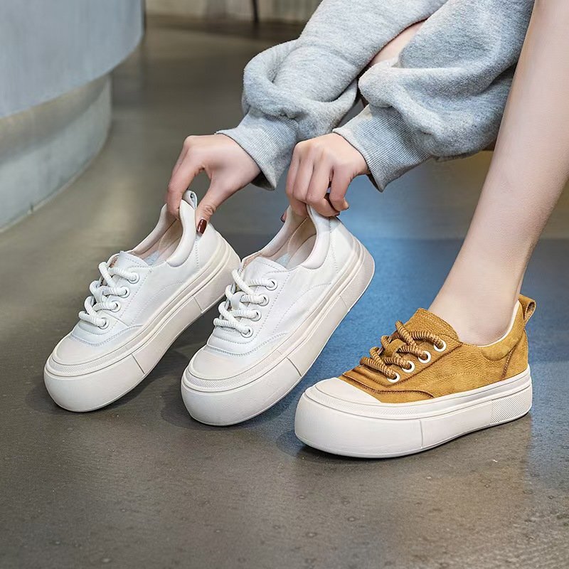 LRM3470★2024年春の新型の単靴の頭の層の牛革の大きい頭の靴の包頭は平らなカジュアルな白の靴を結びます柔らかい皮の女