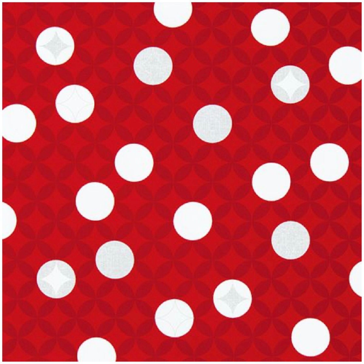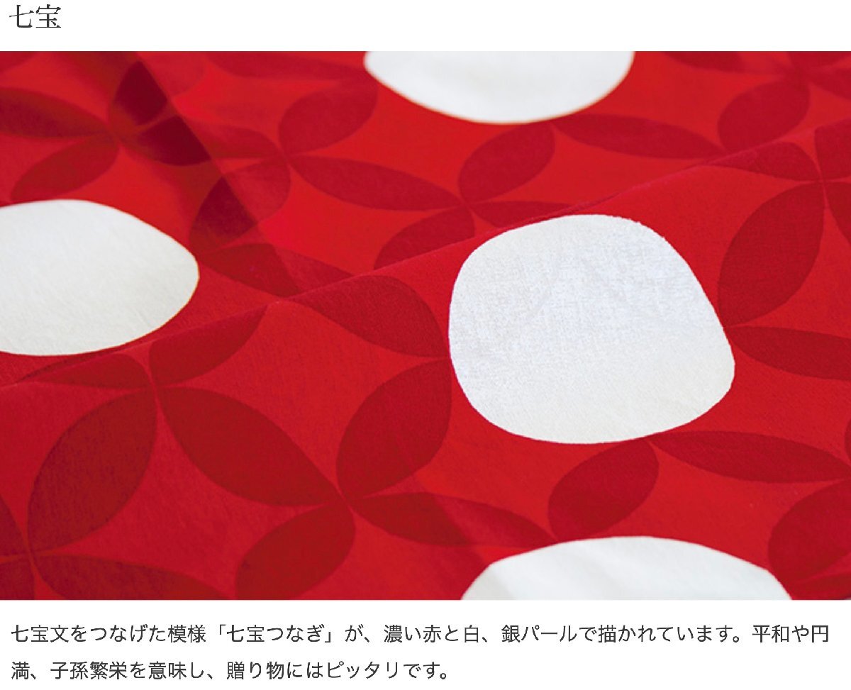 一見すると赤いドット柄ですが、角度を変えるとパール顔料でさりげなく七宝文をつなげた模様、「七宝つなぎ」が施されているのがわかります。 無限に連鎖する平和や円満、子孫繁栄を意味する吉祥文様であるし地方は贈り物にピッタリです。 シンプルなドット柄にパール顔料をあしらったデザインは和洋問わず幅広いシーンでご利用頂け、シャンパンやケーキなど洋風の品物を包むのにも適しています。