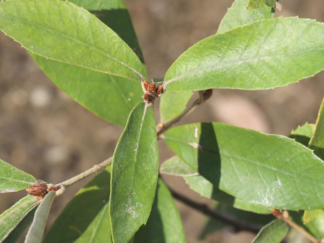 イチイガシはカシ類の中でも特徴ある少し変わった品種です。一番の特徴は全体に付く毛。枝や葉全体に褐色の毛が多くつきます。葉は硬く上半分に鋭い鋸歯があります。葉表面につく毛は次第に取れて綺麗な深緑に変化していきます。結構大きくなり、神社などに植林されます。良質な木材になるそうです。