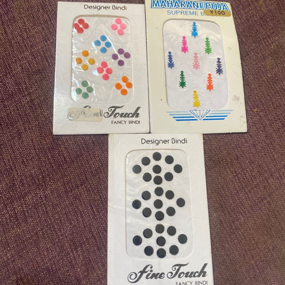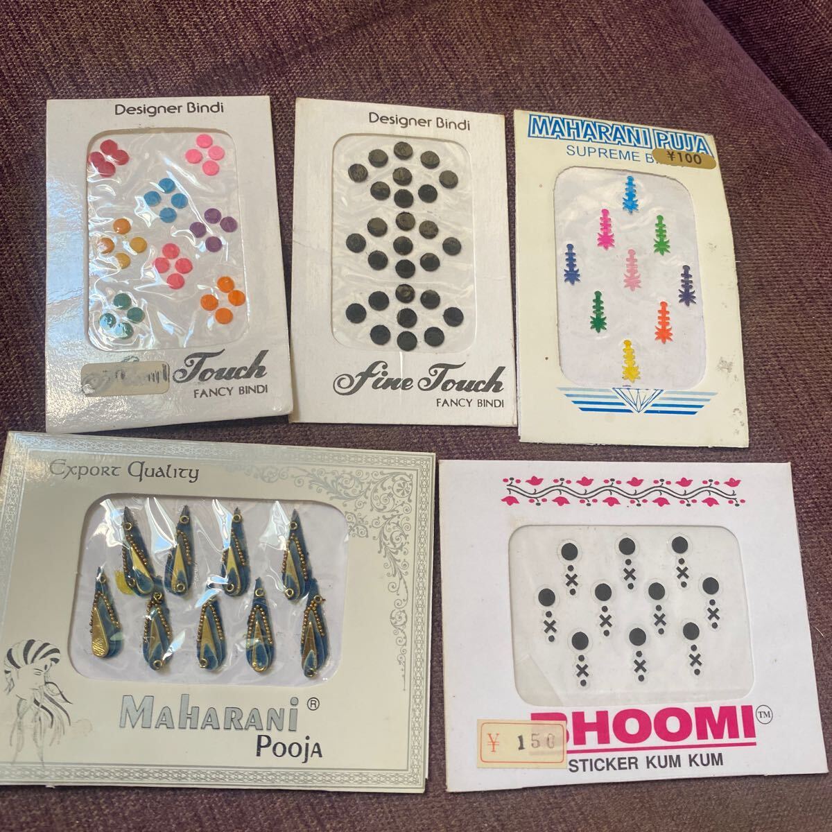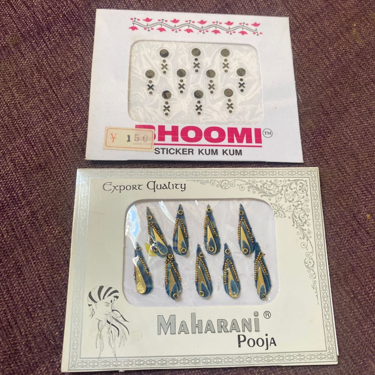 インドの女性がおでこに貼っているシール状のアクセサリーです。(もともと、ヒンドゥー教徒の既婚(夫、存命中)女性が額の中央につけるもの。第3の目。魔除け)