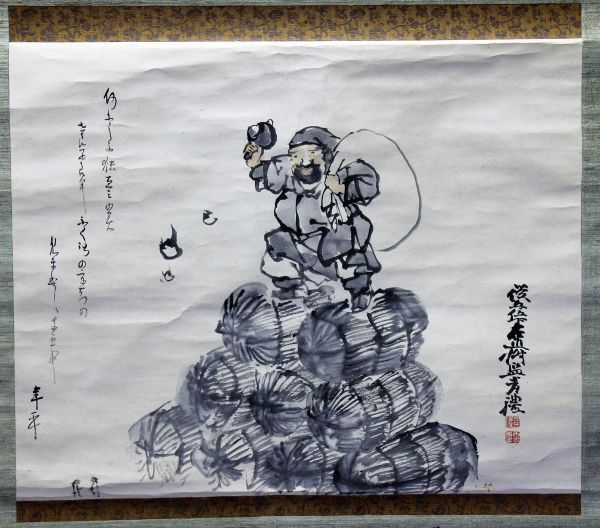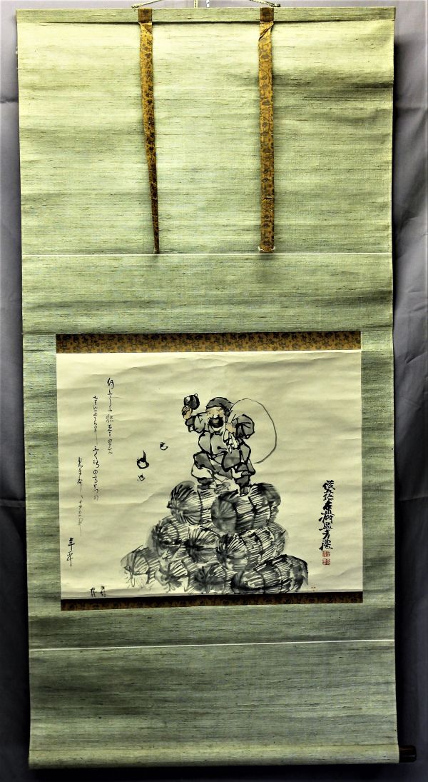 B-126★ 掛軸 岸礼 雲峰 大黒天図 軸先木製 紙本肉筆 蔵出 古玩