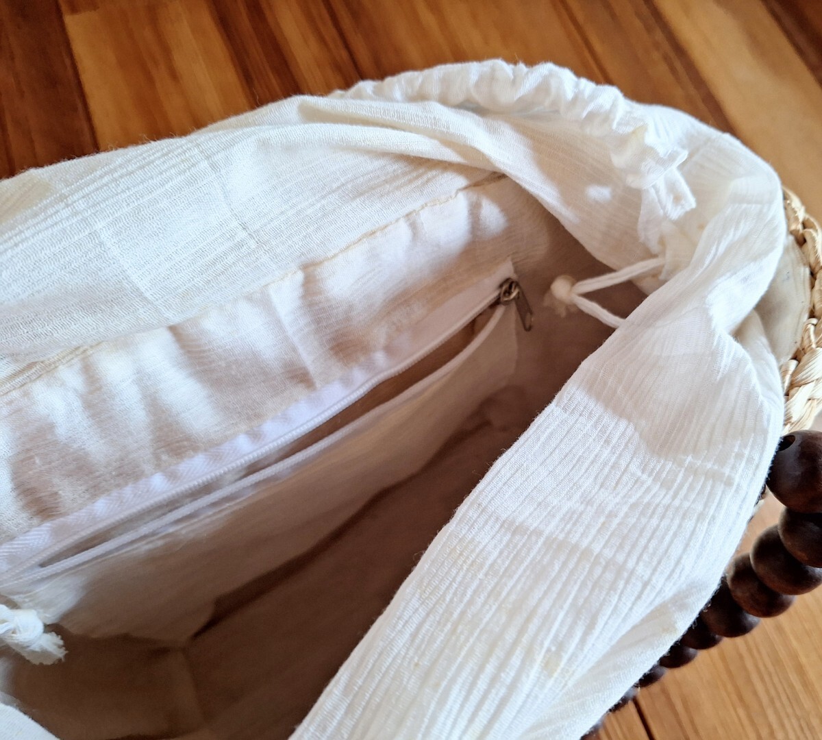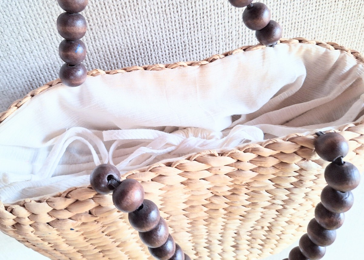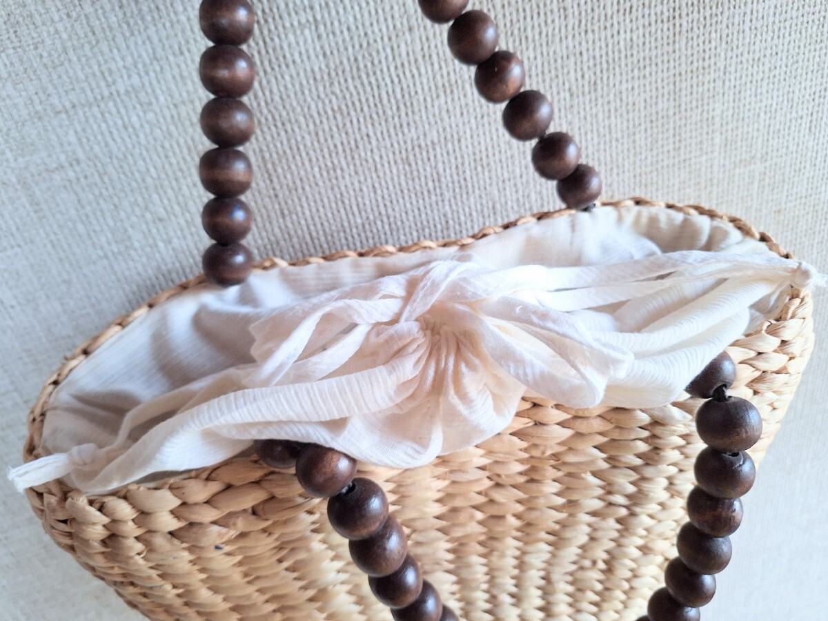 持ち手に木製の玉を繋げたデザインで巾着一体型のかごバッグになります