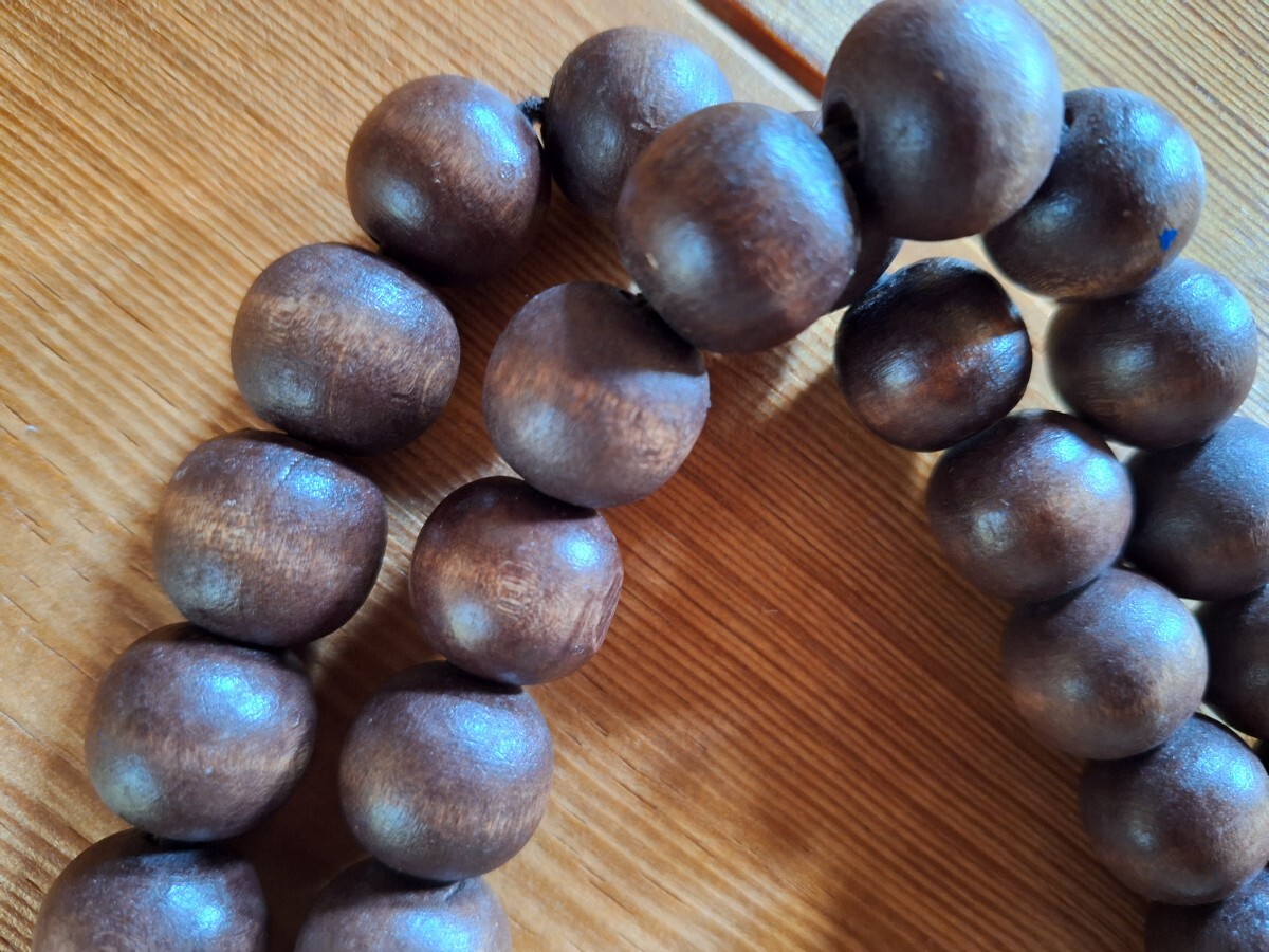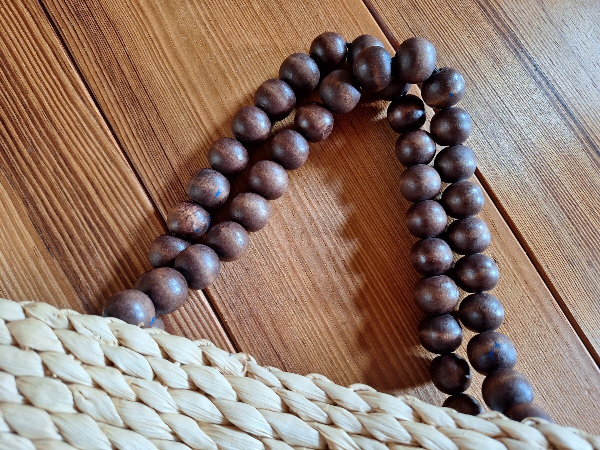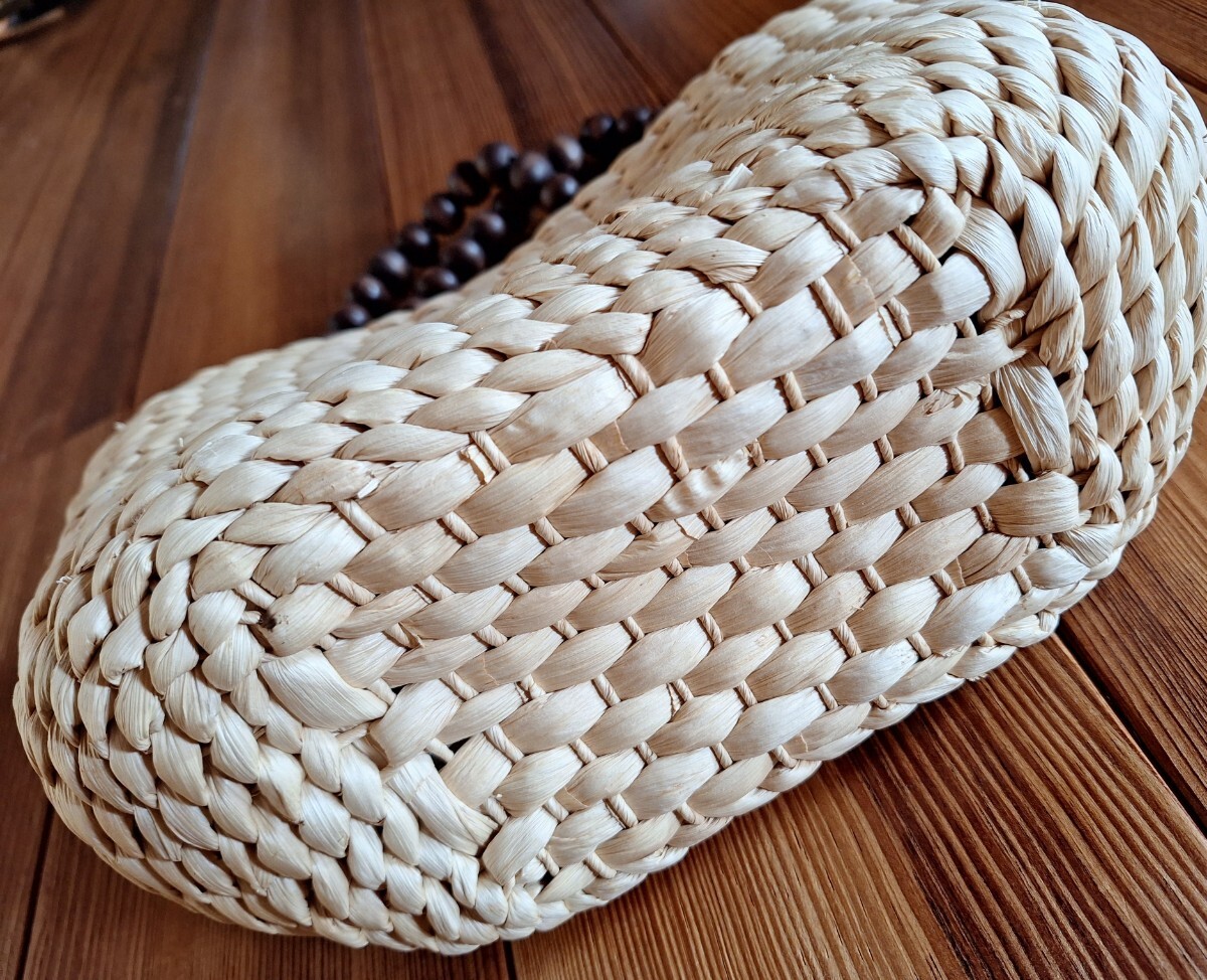 持ち手に木製の玉を繋げたデザインで巾着一体型のかごバッグになります