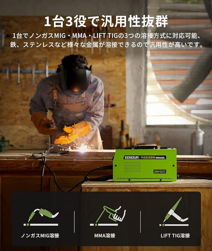 半自動溶接機 MIG 120L 最大出力120A 1台3役 ノンガス インバーター搭載 100V専用 小型 軽量 初心者向け 簡単な修理 家具 雑貨のDIY