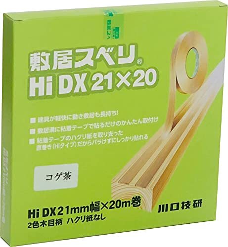 「技研 敷居スベリ HIDX 21X20M コゲ茶」▼4971771012195▼(商品説明)・コゲ茶 HIDX 21X20M コゲ茶・・Color:コゲ茶・ふすま・障子の開け閉めをスムーズに。・サイズ:幅21mm×20m巻・材質:ポリエチレン、アクリル系粘着テープバラバラにならず、軽快に貼れます。 敷居も建具も減らず、痛まず良くスベリます。 木目柄は筋が根本まで浸透しております。 【注意事項】 敷居スベリは室温に馴染ませてからご使用下さい。 貼る前には、敷居溝のゴミや汚れ等を取り除いてください。 貼る際には強く圧着してください。 日々の使用により磨耗しますので、スベリが悪くなった際は貼り替えをおすすめします。 【特長】 建具が軽快に動き、敷居も長持ちします。