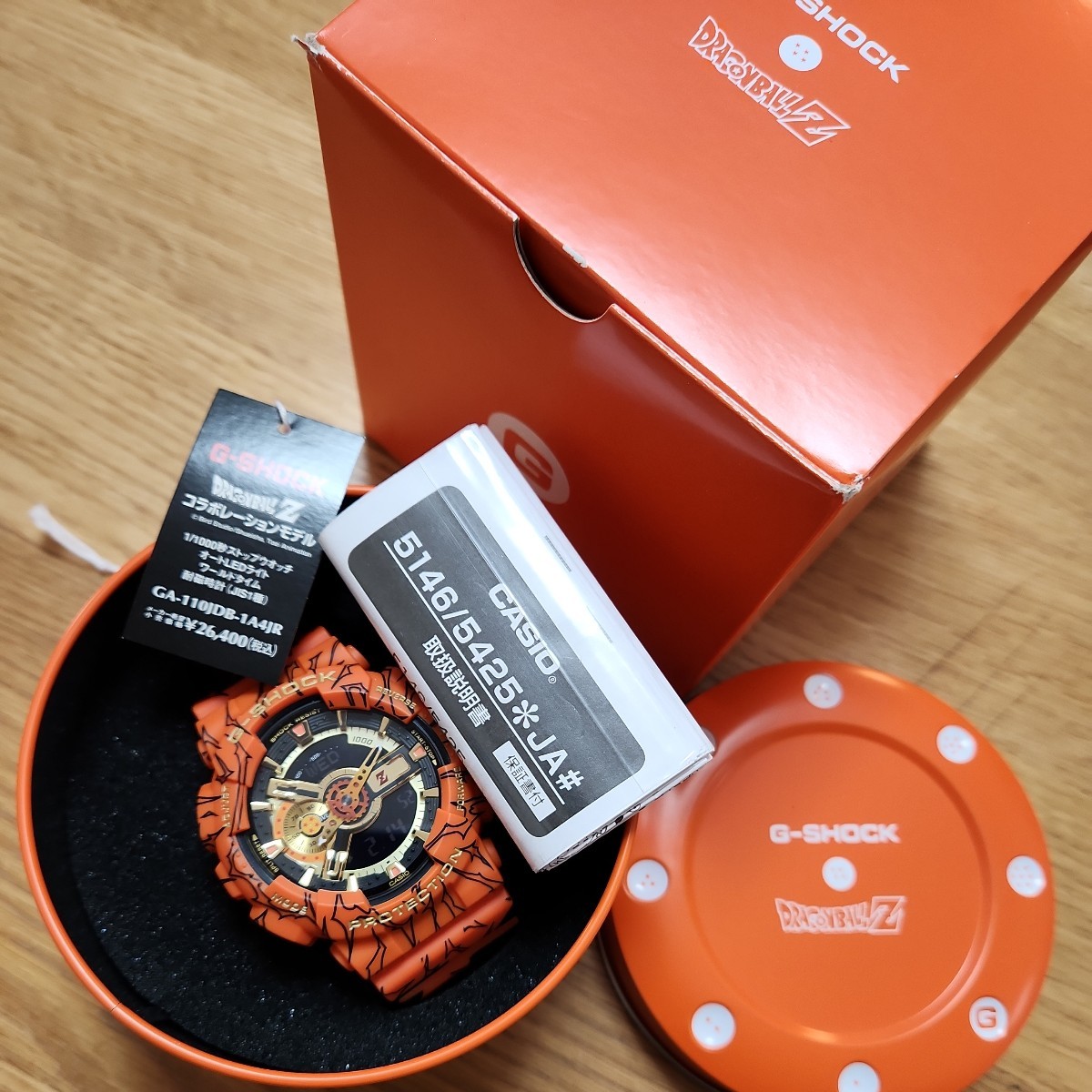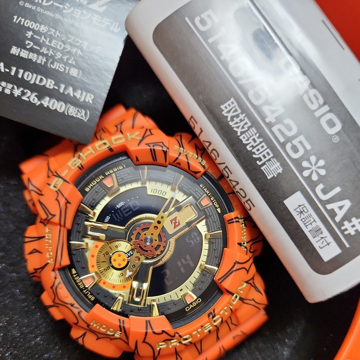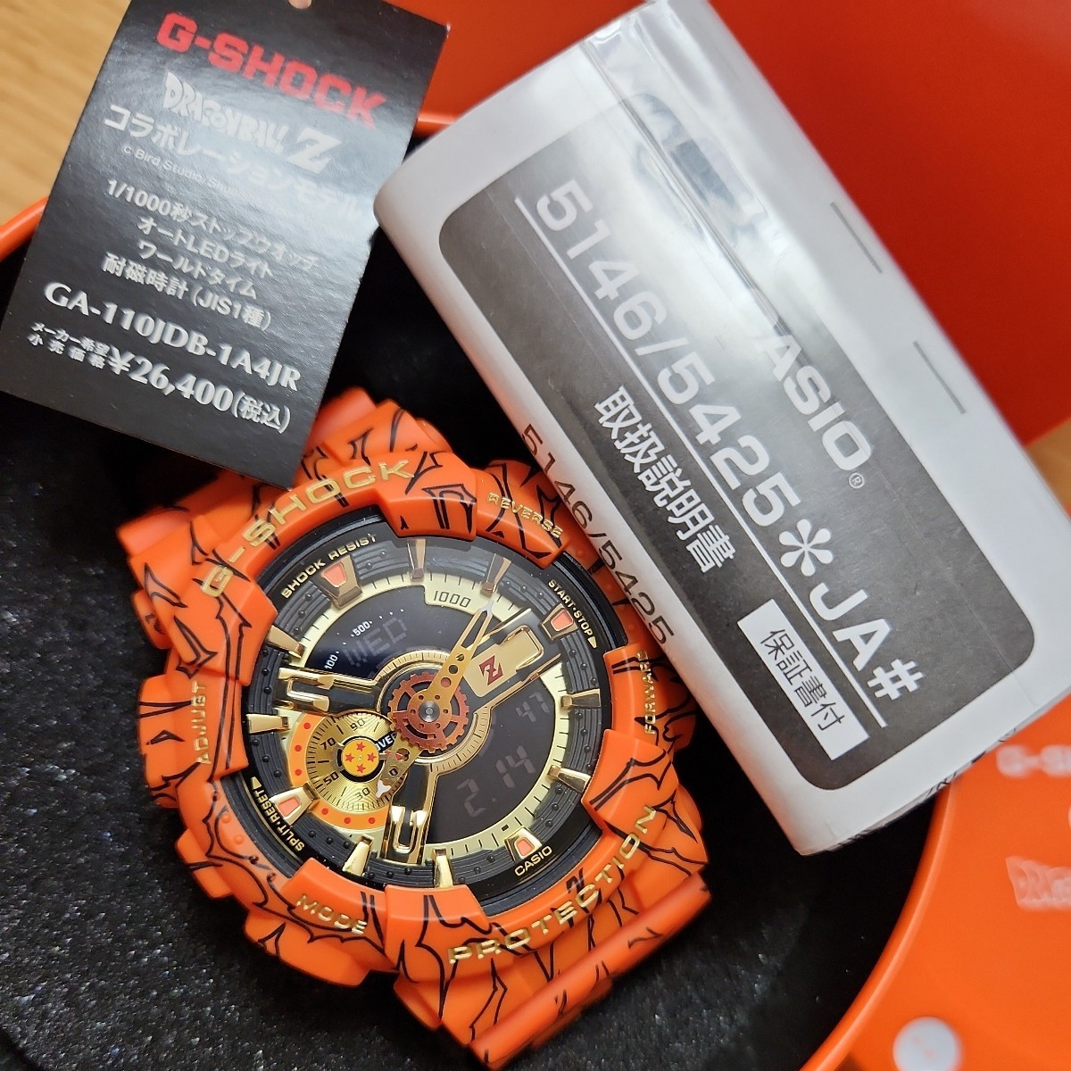 CASIO Gショック 希少モデル! ドラゴンボールモデル GA-110JDB-1A4JR 新品、未使用、完品 付属品、専用箱痛み有り 取説、プライスタグ付き ガラス、裏ブタ傷無し! 写真に有ります様に箱の底が一部破損しています。