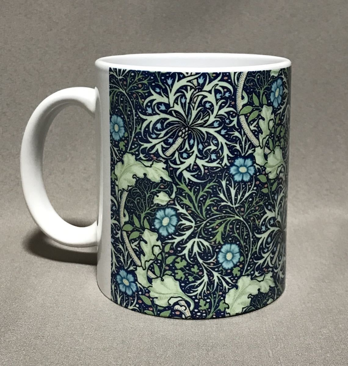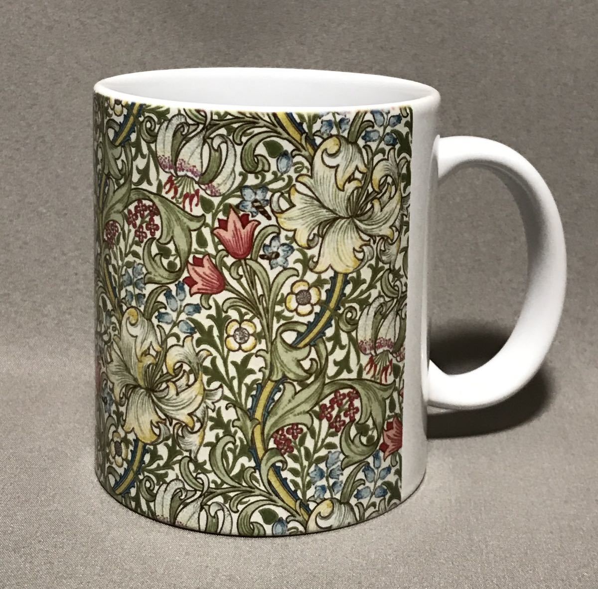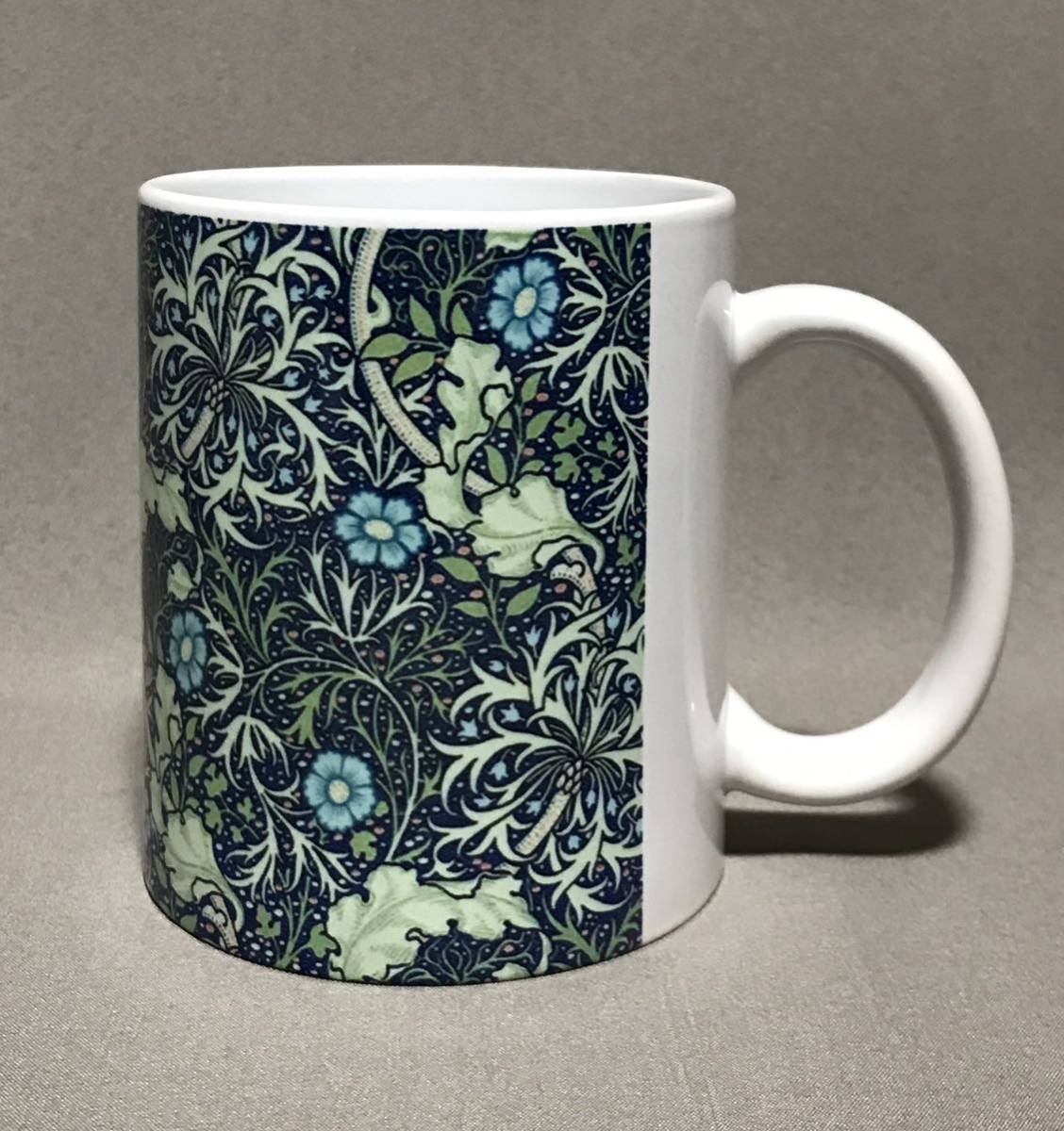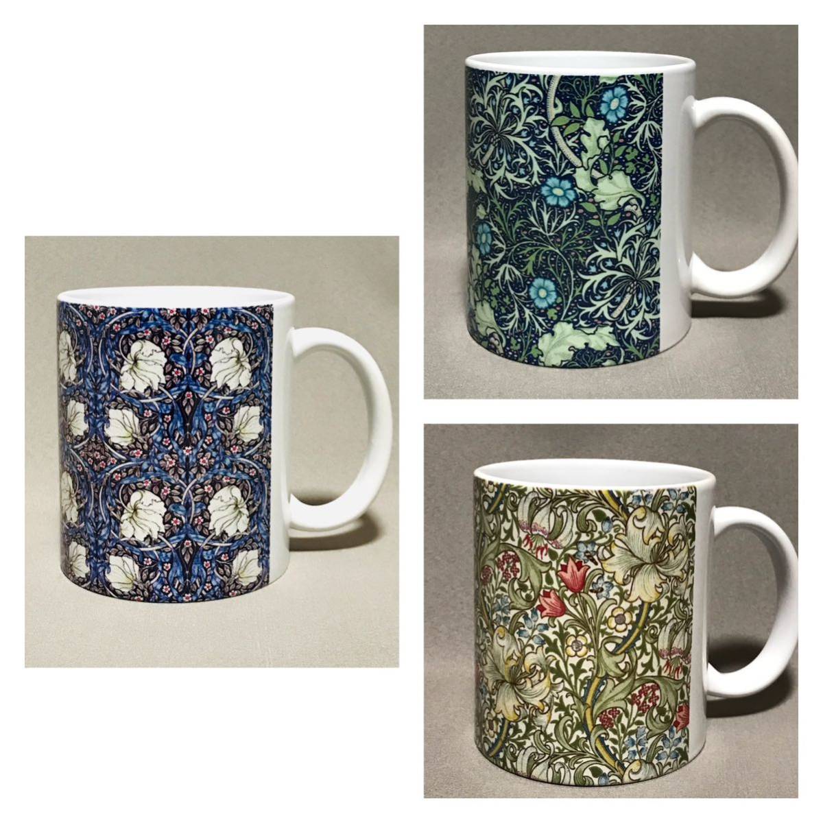 ウィリアム・モリスの、るりはこべPi mpernel、海藻、ゴールデンリリー柄をそれぞれ全面に美しくプリントした陶器マグカップ3個セット、新品。