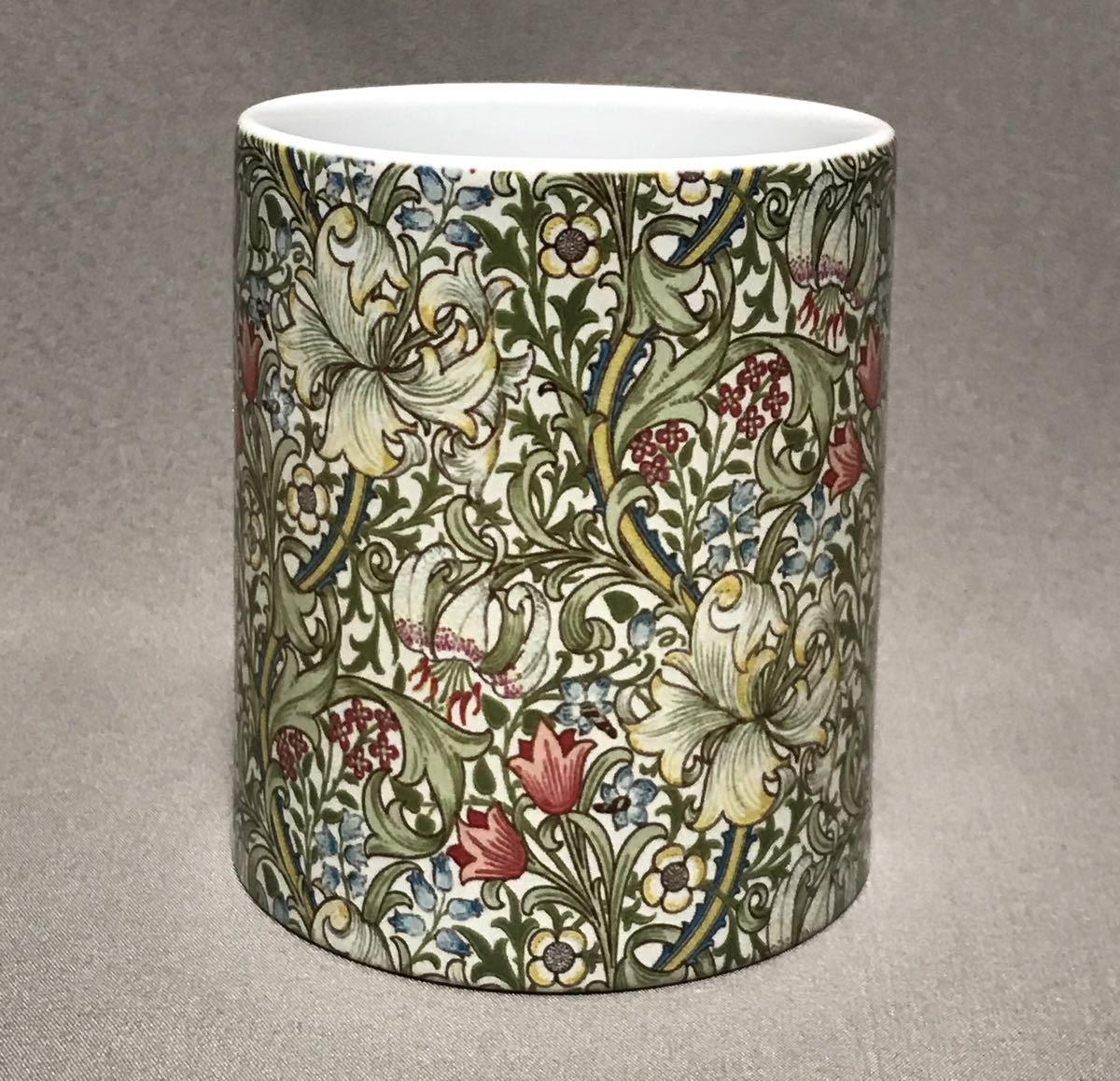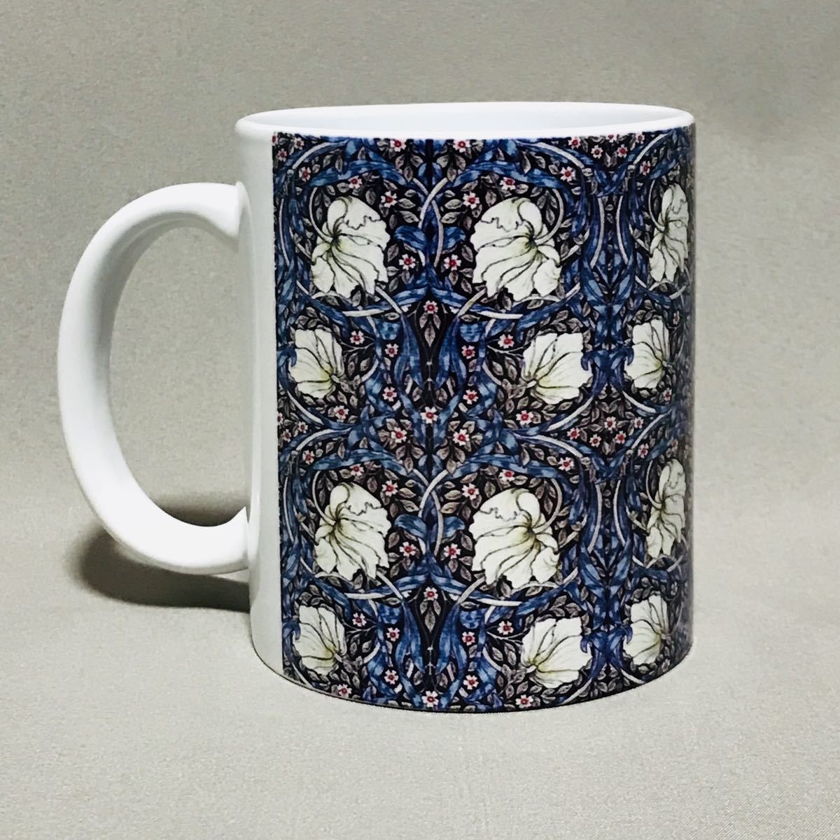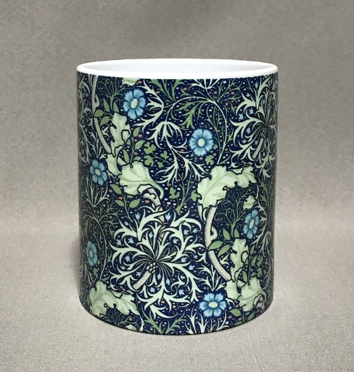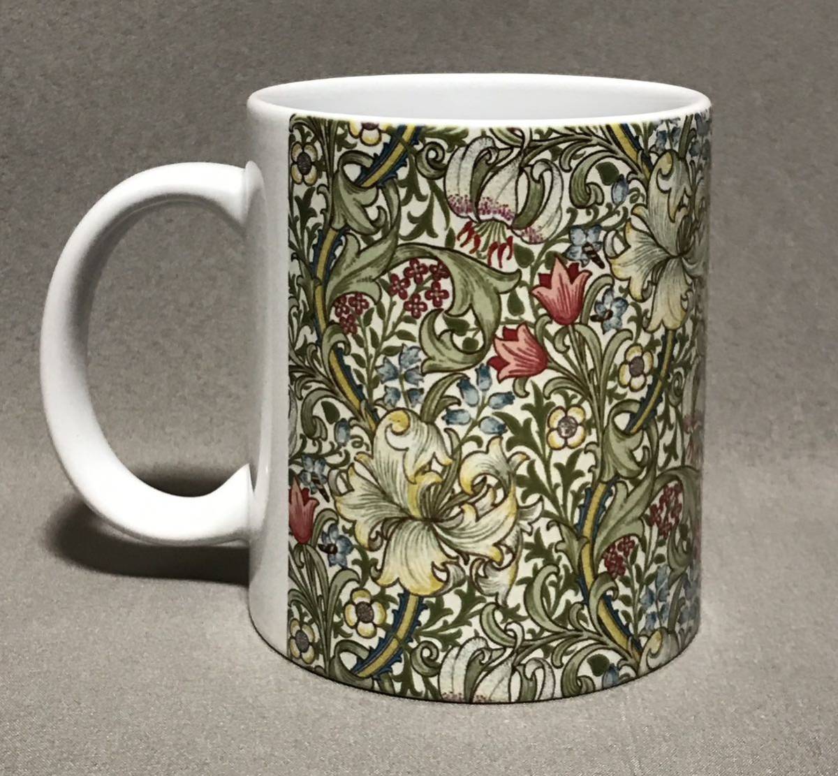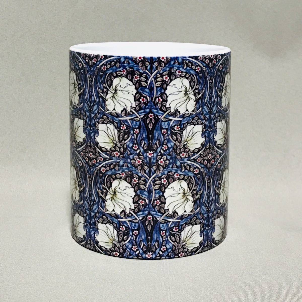 ウィリアム・モリスの、るりはこべPi mpernel、海藻、ゴールデンリリー柄をそれぞれ全面に美しくプリントした陶器マグカップ3個セット、新品。