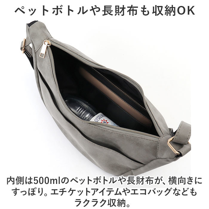 商品説明 | ・・メインからサブまで幅広く活躍。Lafielから「マット合皮 ムーン型ショルダーバッグ」が新登場。 ・【コンパクトながら頼りになるバッグ】 ・サッと手に取れるサイズ感。マチを設け、マストアイテムがしっかり収まる容量をキープ◎ ・【使い心地軽やかでストレスフリー】 ・軽い質感で上部にかけて厚みを抑えた、体にフィットするフォルム。負担がかかりにくく、両手が空いて移動の多い日も安心。 ・【開閉スムーズ、安心のファスナー式】 ・開口部はファスナー式。サッと開いて取り出しやすく、ファスナーを閉じれば中身の飛び出しをガード。 ・【ペットボトルや長財布も収納OK】 ・内側は500mlのペットボトルや長財布が、横向きにすっぽり。エチケットアイテムやエコバッグなどもラクラク収納。 ・【小物が迷子にならず安心】 ・内側に4つ、外側に1つポケットを装備。使用頻度の高いものや細々とした物も、バッグの中で探す手間いらず。 ・【アンティーク調のおしゃれな風合い】 ・しっとり柔らかなマット合皮素材。落ち着きがあり、どんなコーデにも素敵にマッチ。フロントの型押しロゴが、さりげないアクセントに。(※素材の一部に、環境にやさしいリサイクル素材を使用しております。) ・【ポケット仕様】 ・内側:オープンポケット×4 ・背面:オープンポケット×1 |