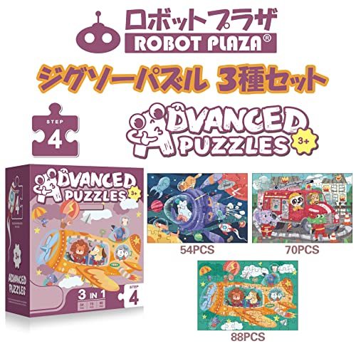 「ロボットプラザ(ROBOT PLAZA) ジグソーパズル 3種セット 54-88ピース 子供向け パズル (3歳以上)」▼4573568580681▼(商品説明)3歳以上・・Style:3歳以上・【 パッケージ内容 】 ジグソーパズル 3種類 セット ピース数: 54ピース 70ピース 88ピース 仕上がりサイズ:36×25cm 参考図付属・【 ジグソーパズル 】 取り扱いが簡単な子ども向けの紙製ジグソーパズル。参考図が付属されておりますので、うまく行かない時ご参考に。・【 想像力と創造性を高める 】 子どもと一緒におうち時間を過ごす。遊びながら想像力と創造性を高めます。お子様の指先の発達にも役立ちます。完成品を見て味わう達成感とやりがい!記念品、インテリア、装飾にもなります。・【 プレゼントに最適 】 誕生日、クリスマス、お祝い、入園祝い、入学祝い、新学期、子供の日、こどもの日、お返し、夏休み、冬休み、ハロウィン、お正月、記念日、など様々なギフトシーンに人気。女の子、男の子のお子様にきっと喜ばれます。ご家族やお孫様への贈り物としても最高。・【 対象年齢 】 3歳以上ジグソーパズルシリーズです。友達ともしくは親子達が協力しあって、楽しくピースを組めましょう!完成したジグソーパズルは綺麗な飾り画。プレゼントにもおすすめです。ジグソーパズルは子供の知育のための玩具です。ジグソーパズルで遊ぶと、想像力、集中力、直感力、観察力の向上する効果があります。長い間、集中力を要すると同時にコツコツと取り組む忍耐力が求められますので。この地味な作業の繰り返しで強い忍耐力をを養えます。友達、親子で一緒に困難を乗り越え、最後の達成感を楽しみながら、友情、親子の絆も深める理想の玩具です。子どもの成長に良い! ジグソーパズルは幼児の発達段階や個性に応じて、無限の展開と可能性を持つ教育的玩具であると言われてます。パズルや積木は構成の練習にリハビリでも使います。脳にいい刺激を与えます。もちろん構成以外にも記憶力・集中力にもいいです。 図形の認識、記憶、色の判別ができるようになる他、「知覚統合」といって、目で見た情報を取り込み、全体を意識しながら部分を関連付けて意味あるものにまとめ上げる能力を育むそうです。 もちろん大人にも良い!