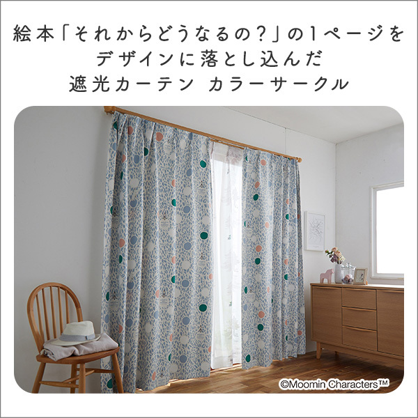 絵本「それからどうなるの?」の1ページをデザインに落とし込んだドレープカーテン